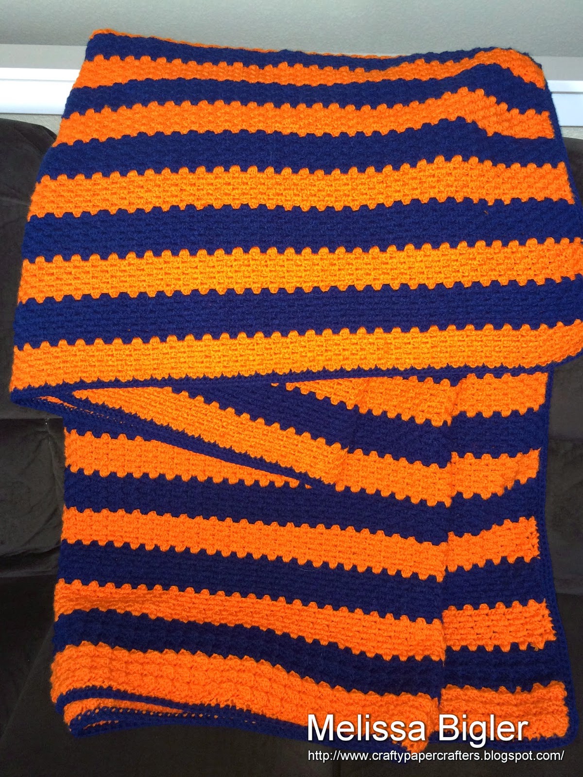 Whoohoo! The Bronco blanket for my son is officially done. It took longer than I anticipated, but I’m very happy with how it turned out and he is too.