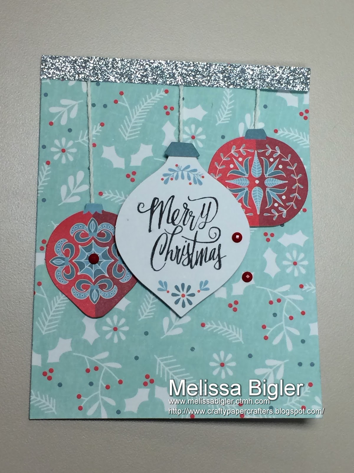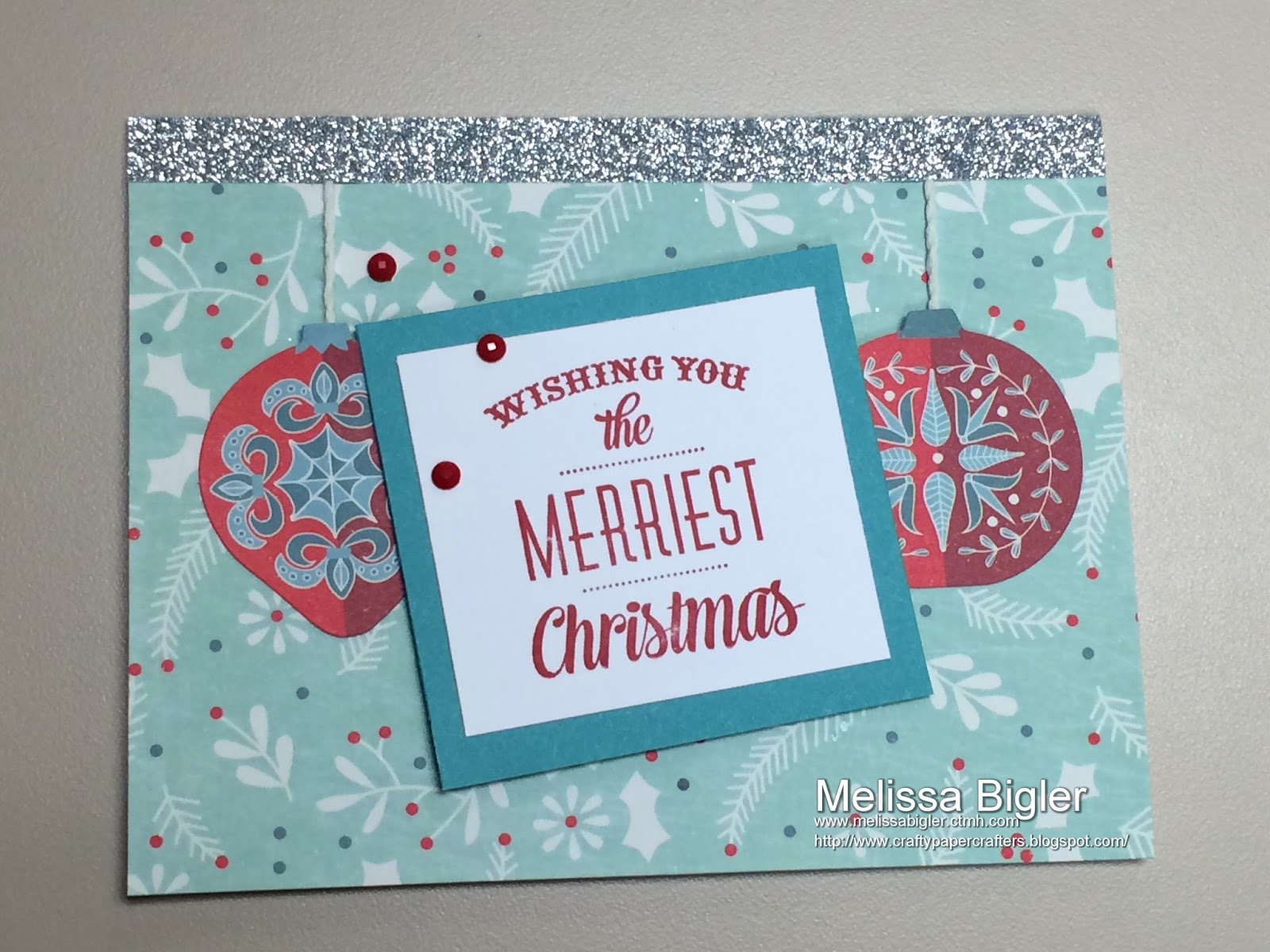 I used the Merry Christmas M size stamp. At $2.95 this is a great bargain and I know it will be used over and over! I added the silver shimmer trim to each card to make the string stay at the top and I felt like it gave me a cleaner edge.