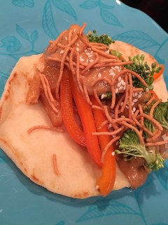 I ended up getting home with a few minutes to spare and pulled the chicken out and tasted the sauce. It had flavors that I thought might go well with a Thai style peanut sauce. We also had some naan bread on hand and fresh veggies to help pull the “taco” together.
