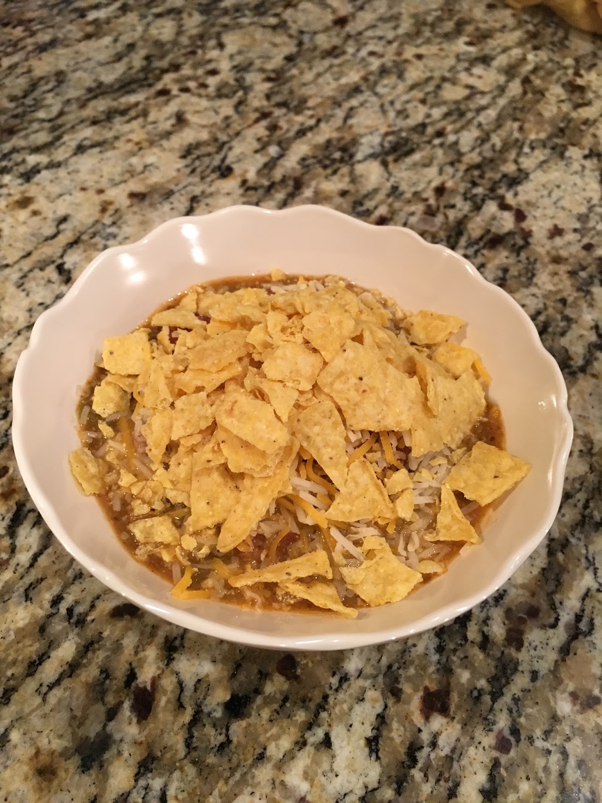 The ways to eat green chili are endless… here lately I’ve liked adding some shredded cheese and chips for crunch. (I forgot the sour cream in this picture… I added it promptly after taking my first bite. I’m a huge fan of hot and cold contrasts when eating.) On this particular night – we also made beef and bean burritos (for the kiddos) and Mark put his on that.
