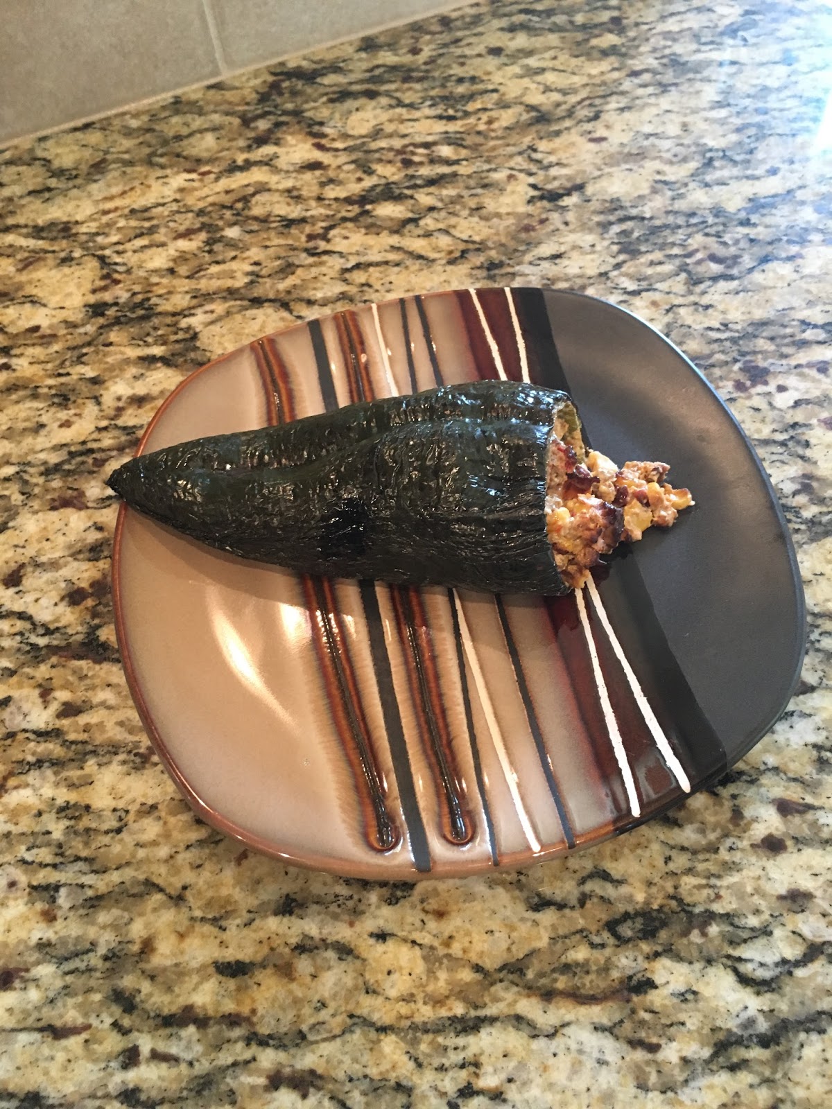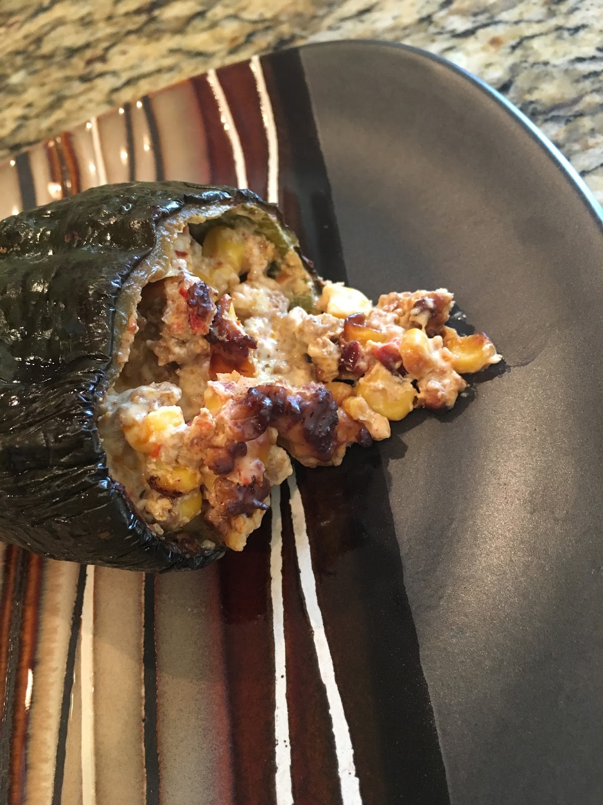 Mix together and split between two large poblanos (tops cut off and seeded):