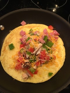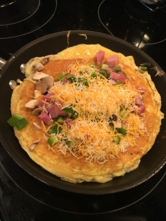 I love the way Mark flips it over to make sure the eggs are getting fully cooked. There are other methods where you don’t flip it over but let it cook a little longer before adding the meat, veggies and cheese and folding it over.