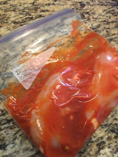 Dump all ingredients except the meat into a labeled freezer bag, seal and mix up. Add chicken breast once sauce ingredients are mixed well.