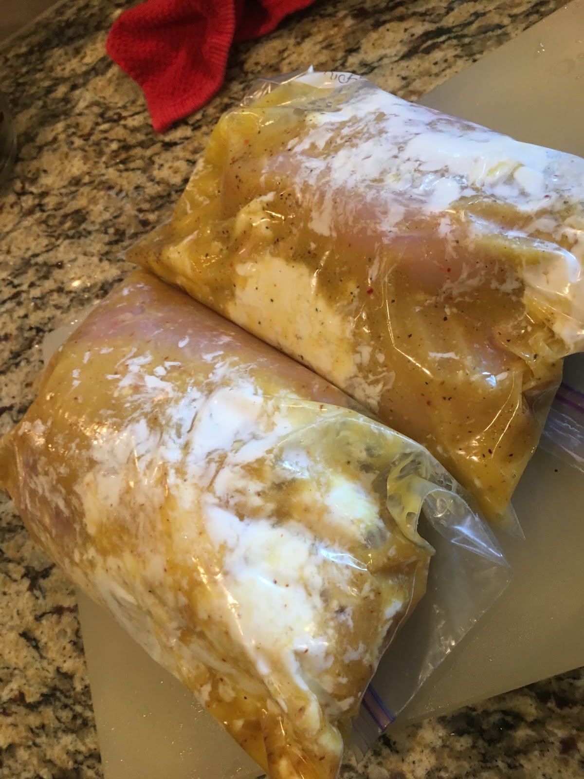 Dump all ingredients except the meat into a labeled freezer bag, seal and mix up. Add chicken breast once sauce ingredients are mixed well.