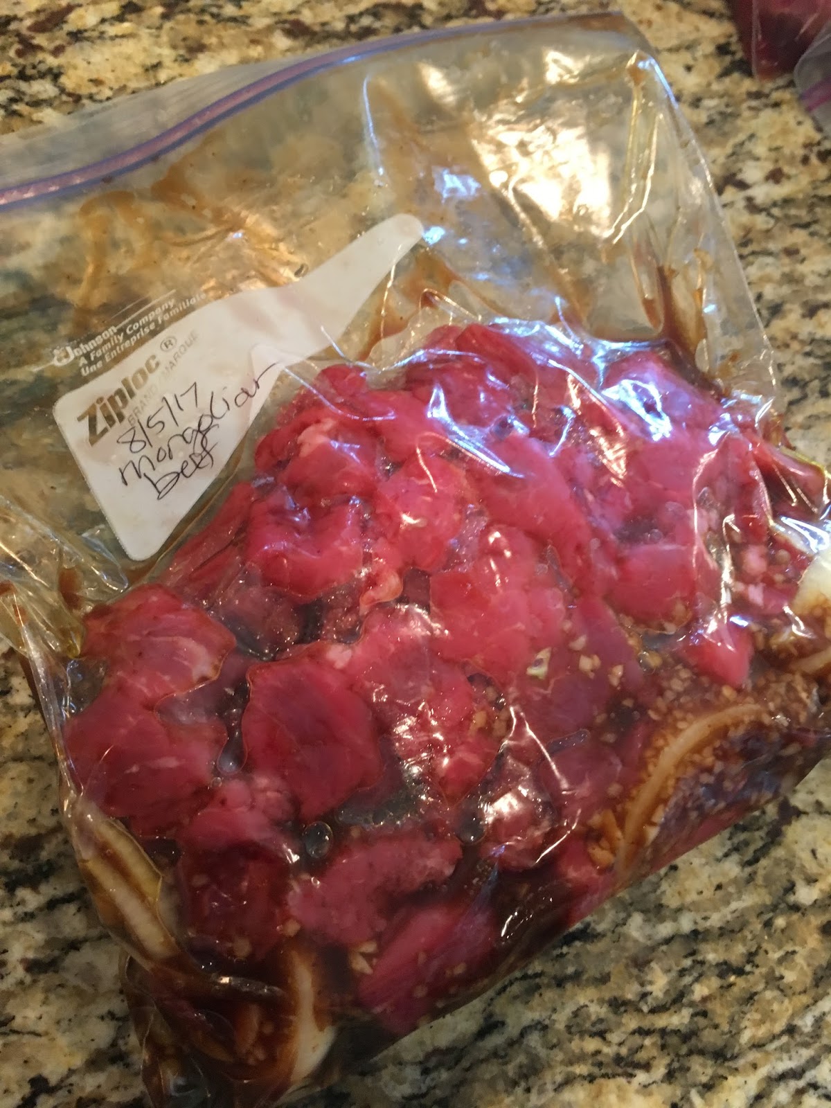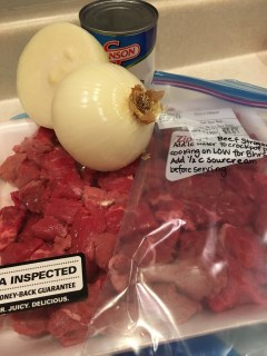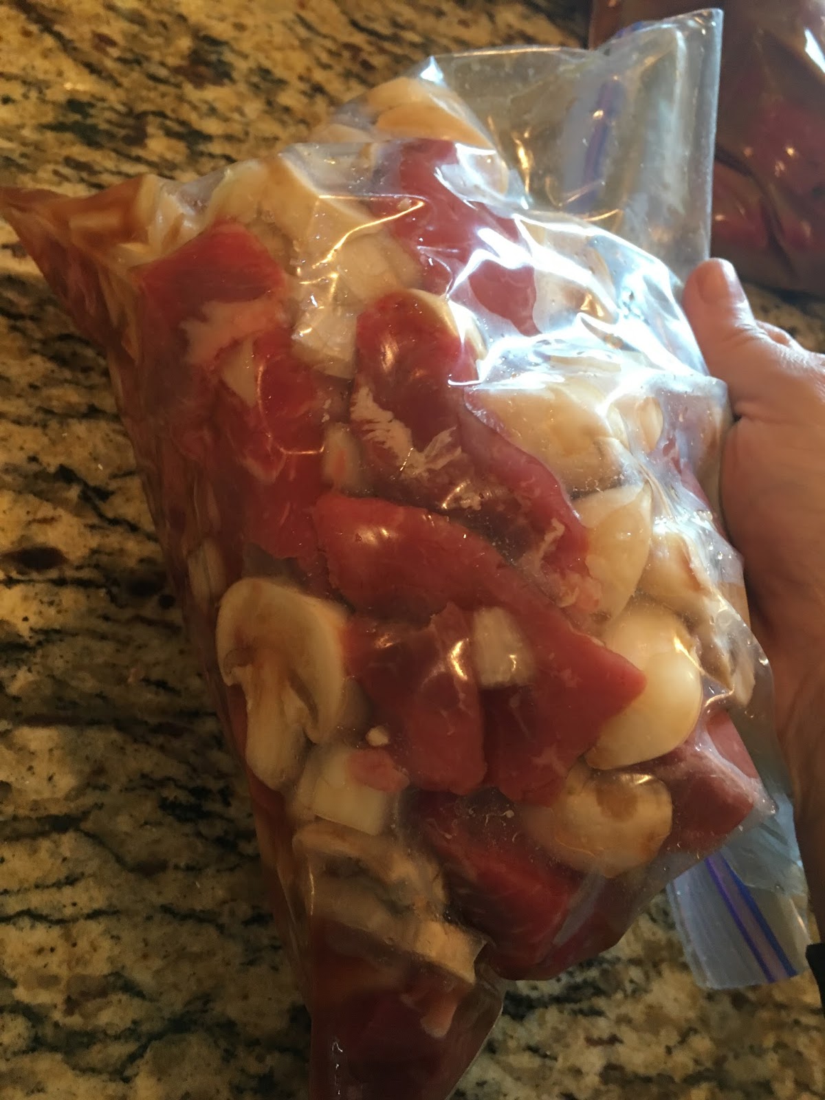 Dump all ingredients except the meat into a labeled freezer bag, seal and mix up. Add stew meat once sauce ingredients are mixed well.