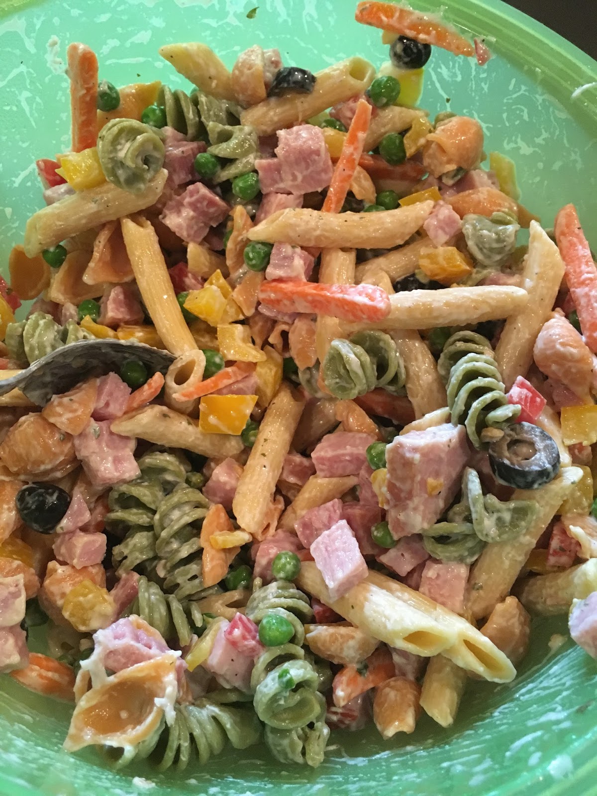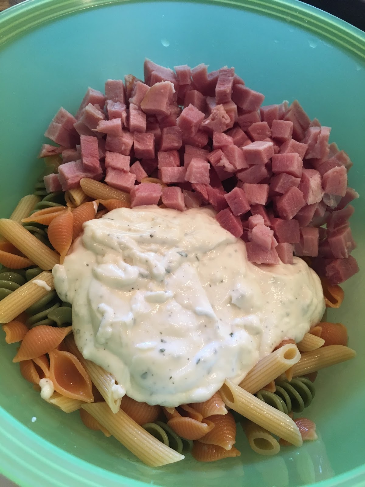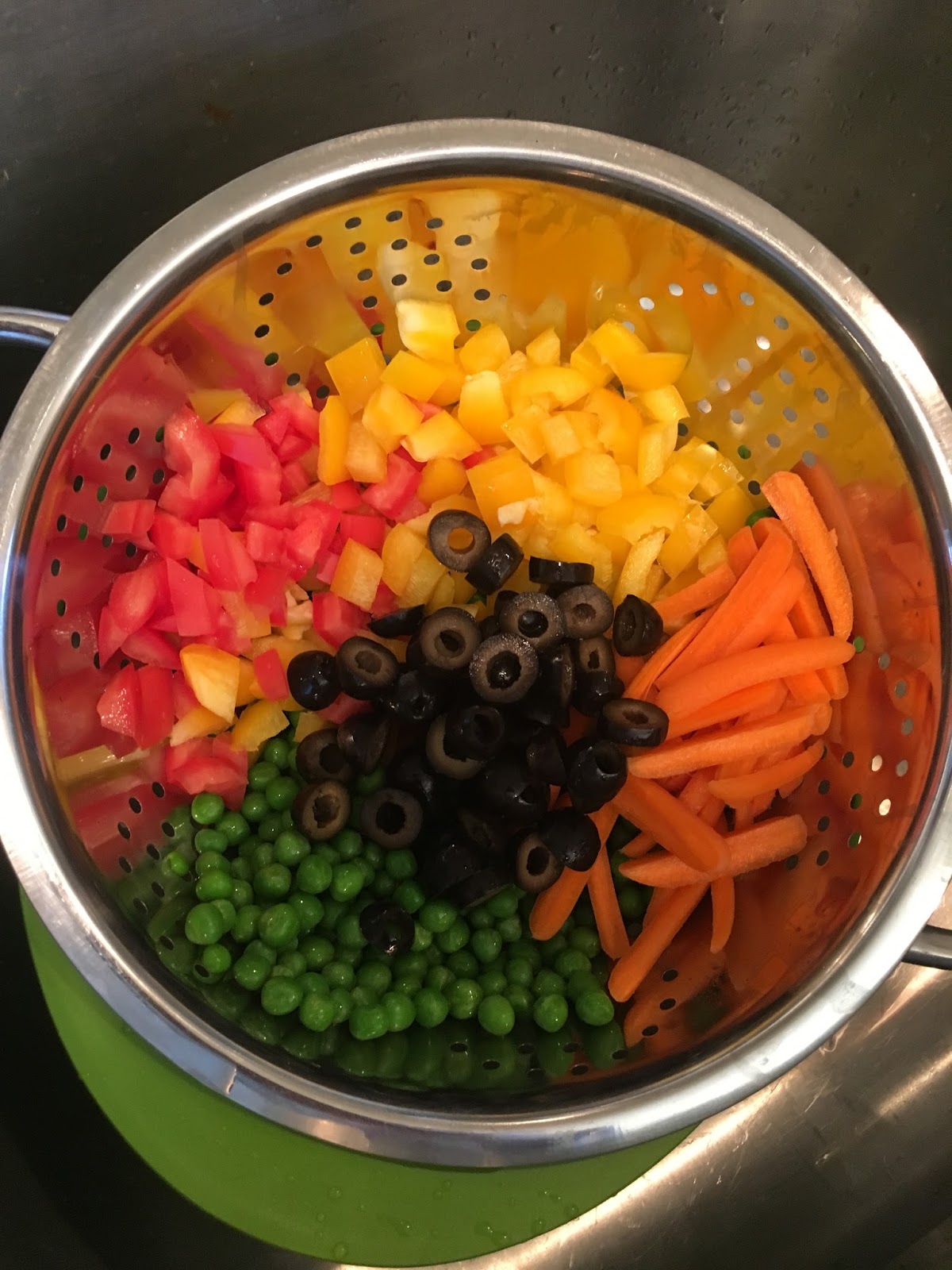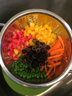Whatever you have on hand will work. We used: peas, black olives, carrots, tomatoes and yellow pepper. Ham steaks were on sale at the store, so I had one ready to use and cut that up to add some protein to the mix.
