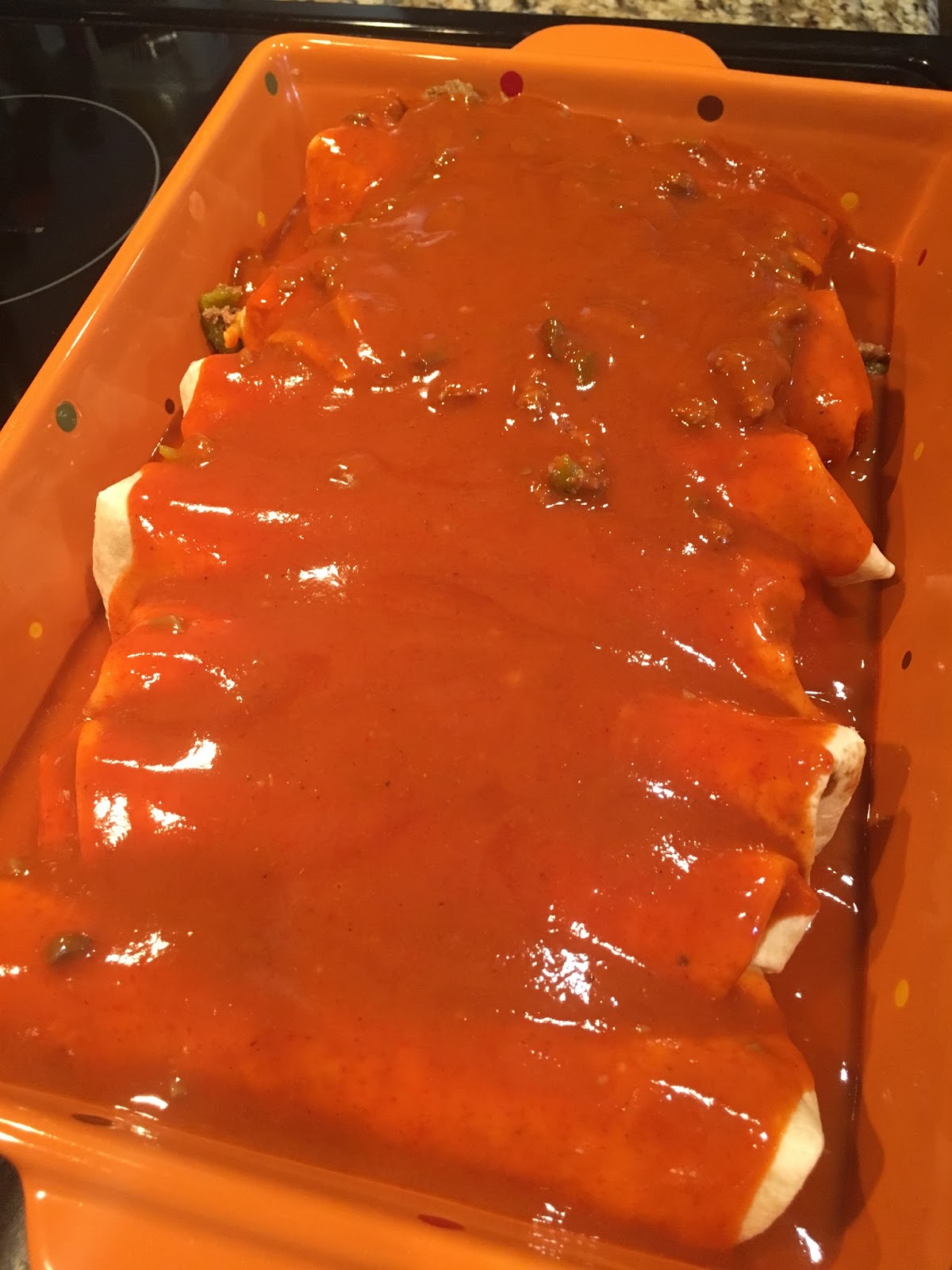 This made 8 burritos for us that were very nicely stuffed with the meat mixture. The bottom ones are the ones for the kids and the other half is for Mark and I with spicy green chiles inside. I made the kid’s burritos first so I could just add the green chiles to the same pot and not dirty any new dishes when adding the green chiles.