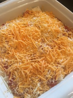 We made two 8×8 casseroles. One to bake tonight and one in a foil tin to freeze.