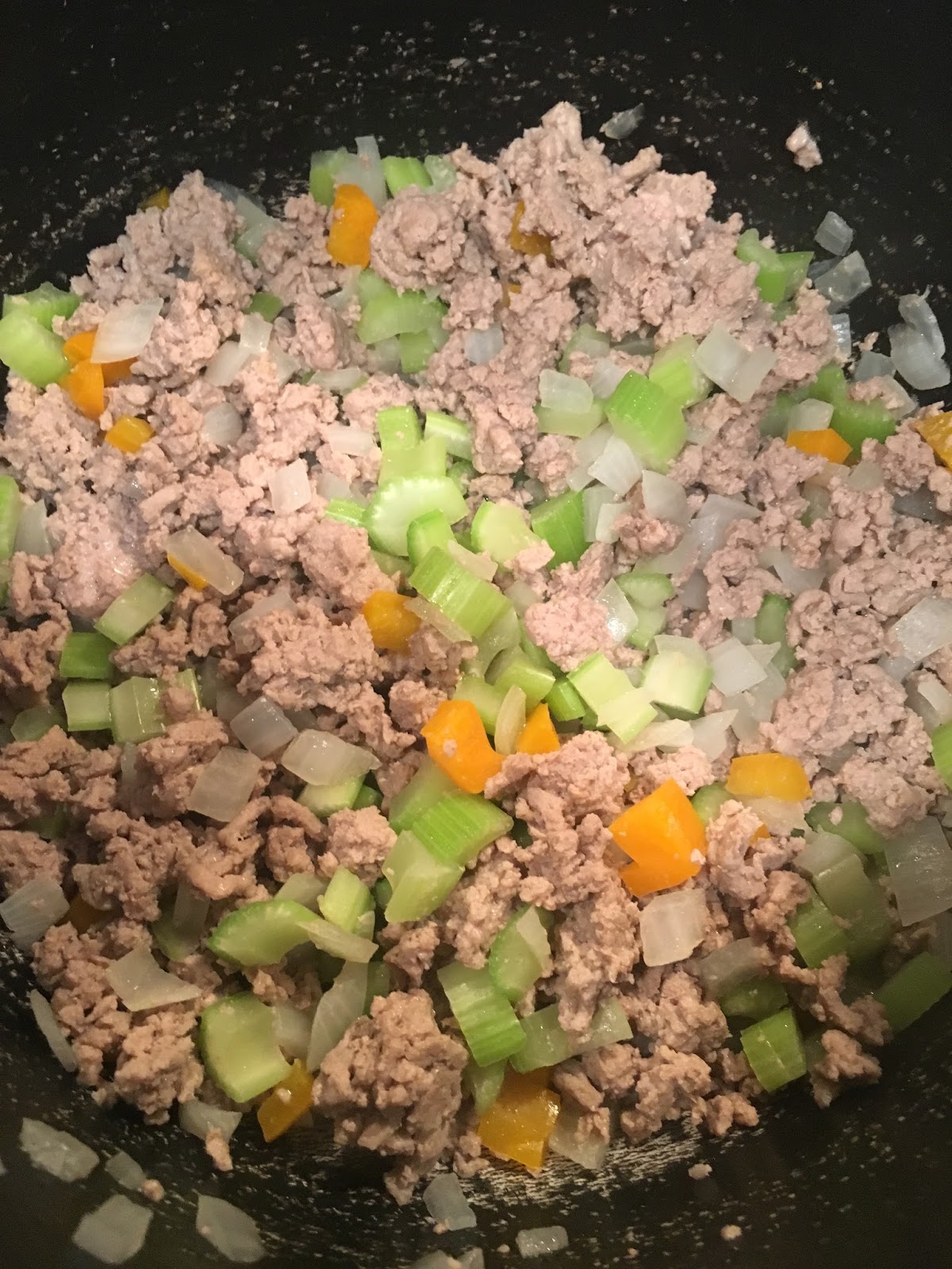 Add all to sauteed chicken and veggies and cook on low for 20 mins stirring frequently: