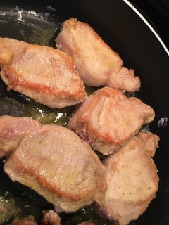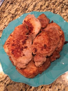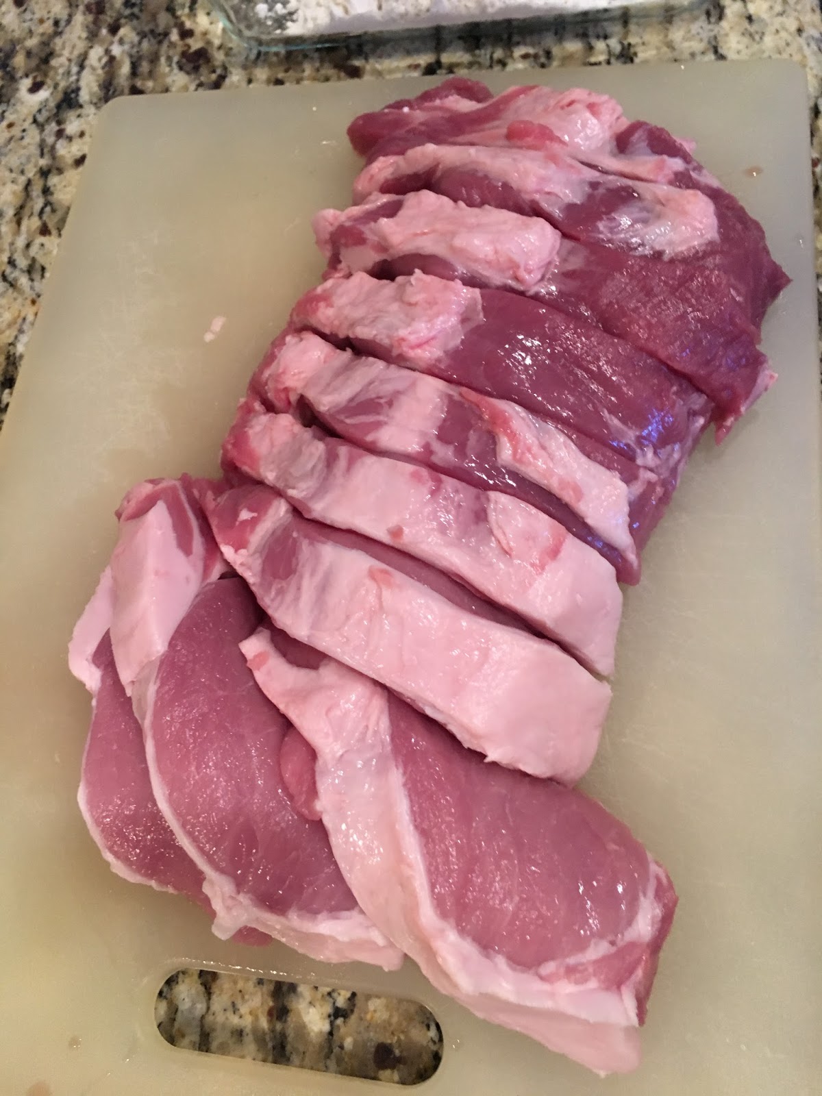 Green Chile is a labor of love in our house. On this particular day my husband wasn’t home to cook the diced pork and I was working with a pork loin. I used the same idea in coating it and frying it but I did it in slices verses diced which cut down huge on time (I was trying to get this in the Crock-Pot simmering away before the little lady and I headed out to church) and I have to believe there were calories saved too because more surface for oil to cook in the diced pork must mean more overall oil.