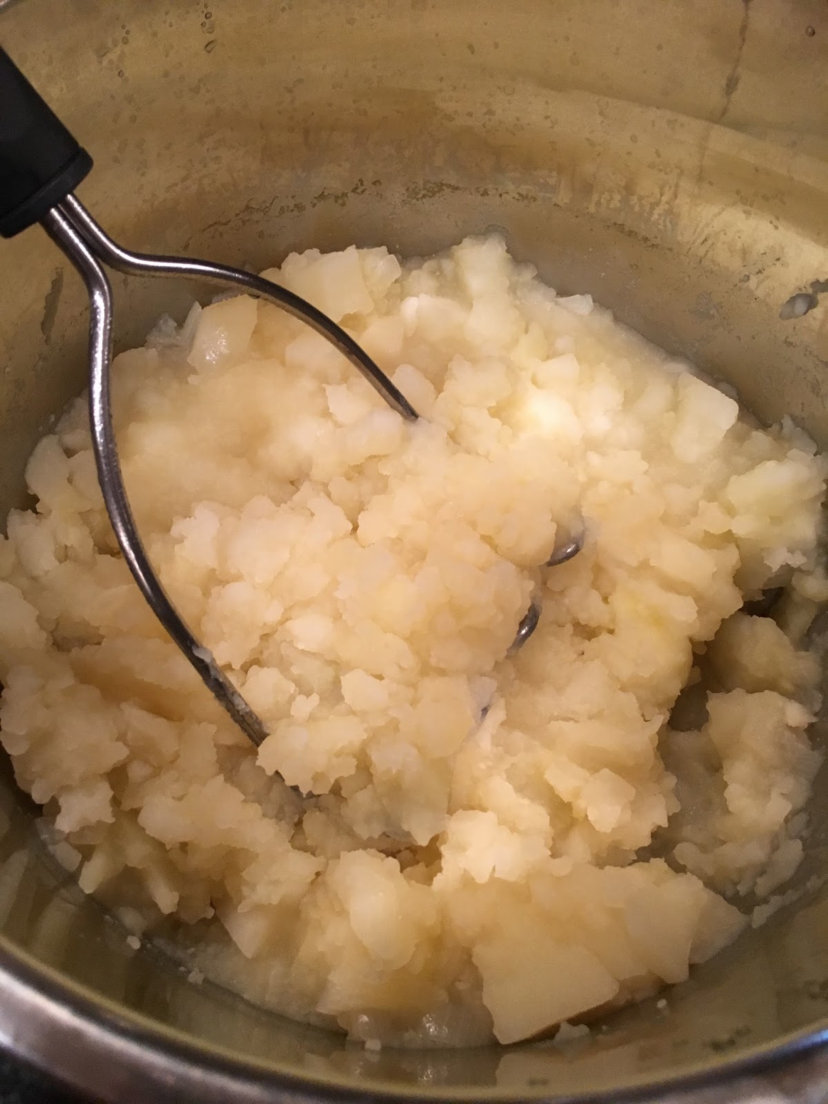 I didn’t jump right into mashing and took some of the chicken stock out so the potatoes wouldn’t be too soupy before I added milk (about 1 cup.) Mash up the potatoes to the texture you like. I like mine pretty chunky so I just used a hand masher for a minute or so.