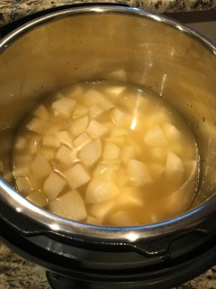 Add to the Instant Pot in the order listed. The chicken stock should just cover the potatoes. 2 cans worked perfectly for us. You might need to do a little more, if your potatoes are bigger. I’m putting the onion on the bottom to ensure it gets thoroughly cooked. I HATE crunching into a crunchy onion. If you like to… put the ingredients in anyway that makes your heart happy. (I like to type out my recipes as I’m cooking them – turns out… I think the onions would have been okay anywhere in the pot.)