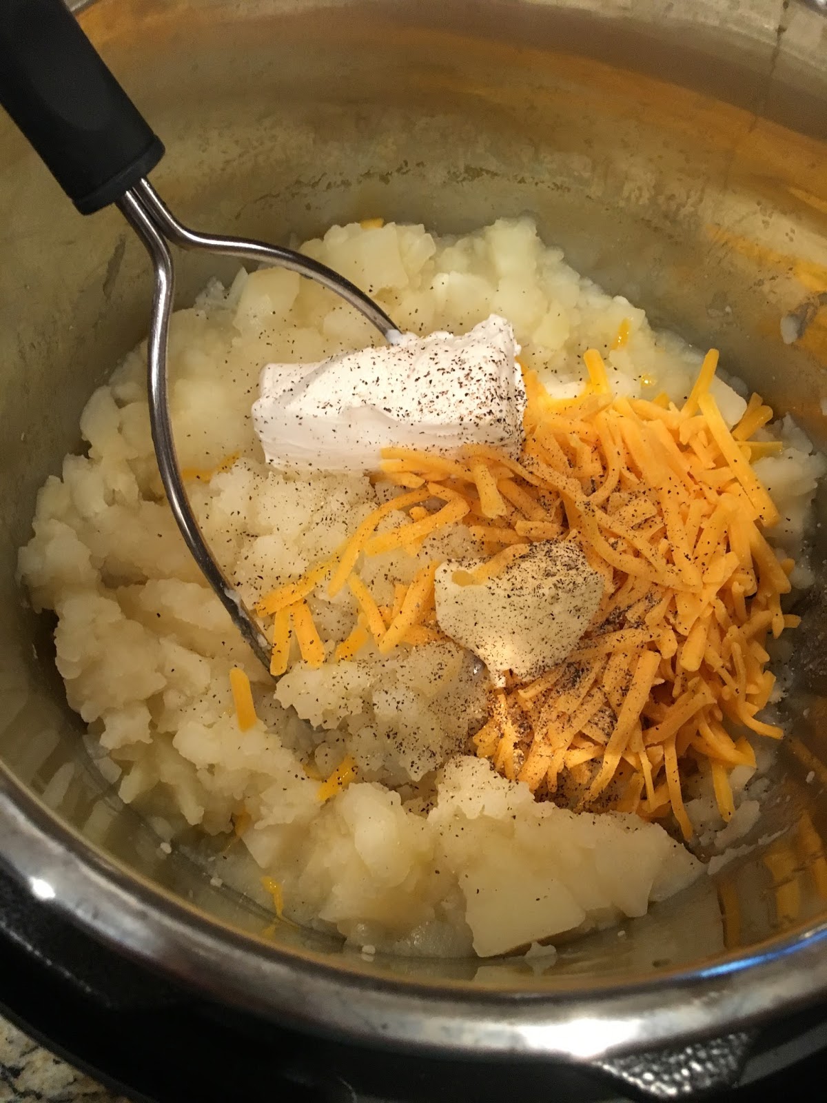 I let the butter, cream cheese and cheddar cheese sit covered in the potatoes for few minutes to help it soften so it could be easily stirred in with the potatoes.