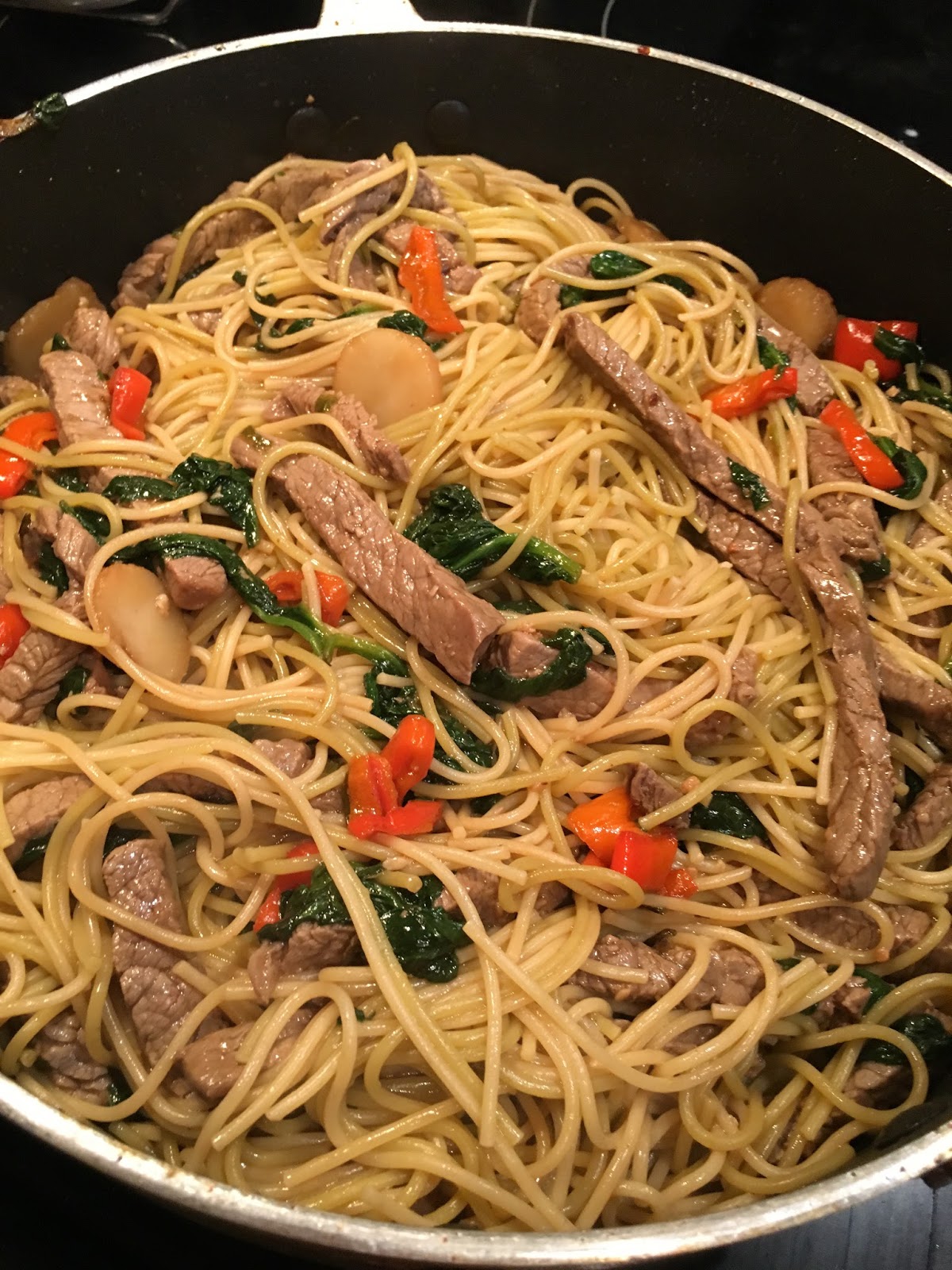 6 oz spaghetti (we did half Barilla regular spaghetti and half veggie pasta)
