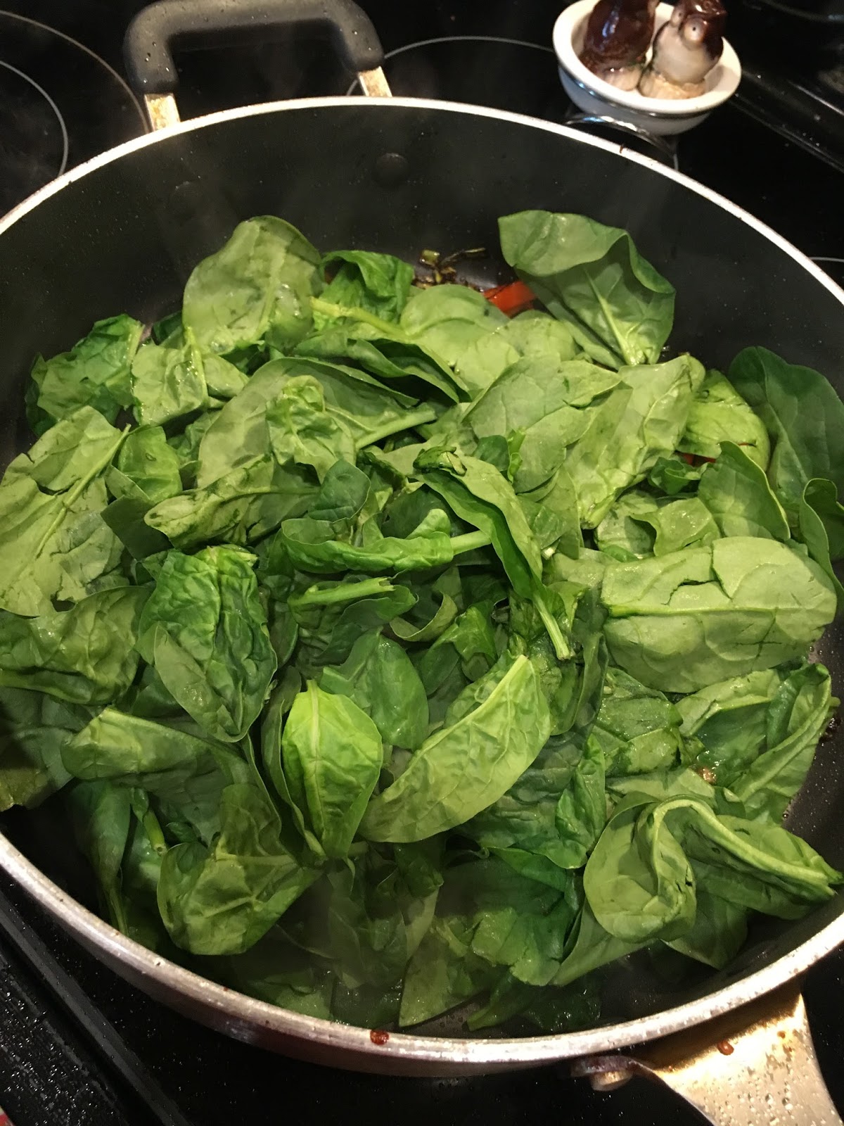 The way the spinach wilts down amazes me each time. I always think of a Rachael Ray 30 minute meal early episode where she points out the frozen spinach at the store is a very good buy because of the amount of spinach it takes to yield that small box. Craziness!