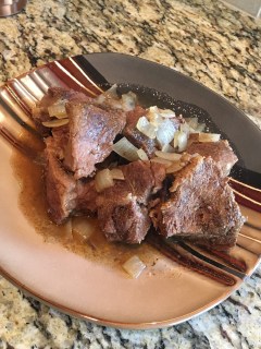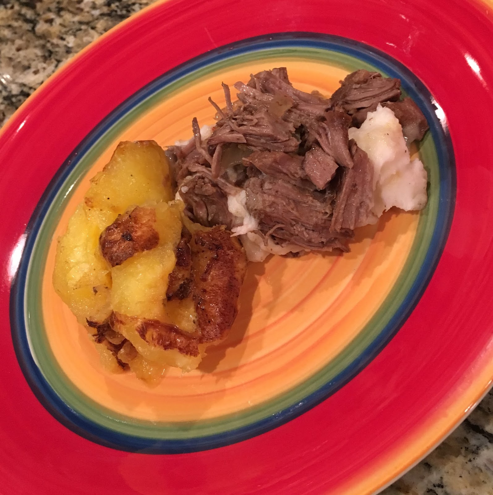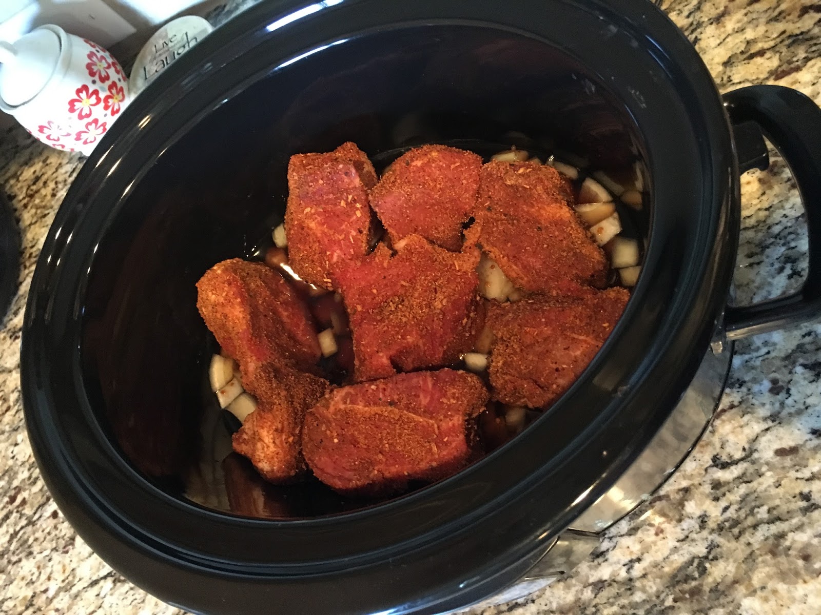 Beef roasts were on sale and I wanted to mix it up with something different, since we recently had beef stew. Here’s a quick and easy crock-pot recipe that I threw together in 5 minutes. I actually very gently threw it together because Emily was taking her nap after church and needed a good one today since yesterday’s wasn’t so good.