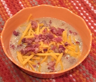 Serve with your favorite mix-ins. Mine are cheese and bacon today… because… well… cheese and bacon can only make something delicious taste even better. Green chiles would be another great addition but we didn’t have any thawed.