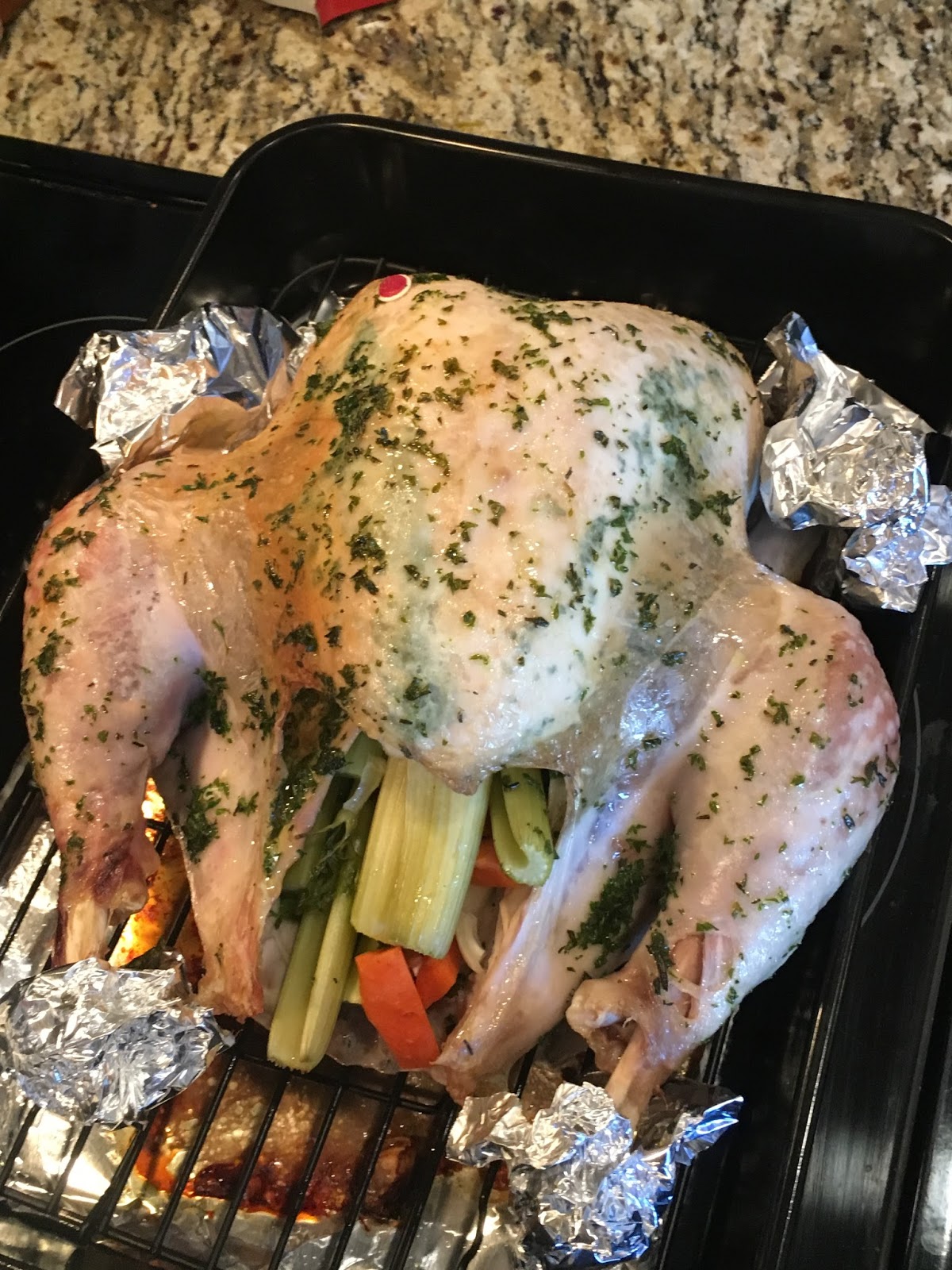 Bake at 325 for about 15 minutes for every pound. Ours was 12 pounds and took just under 3 hours to cook. The picture below is about half way through. I like to cook it covered for the first 1/2 of the time and then pull it out – butter the top and put it back in the oven. Once the color is browned and roasted just like you like it – but the foil back on to finish the cooking process.