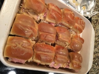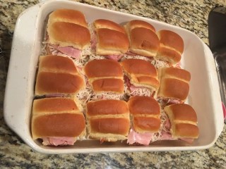 Add 2 thinly sliced pieces of honey ham to each roll bottom