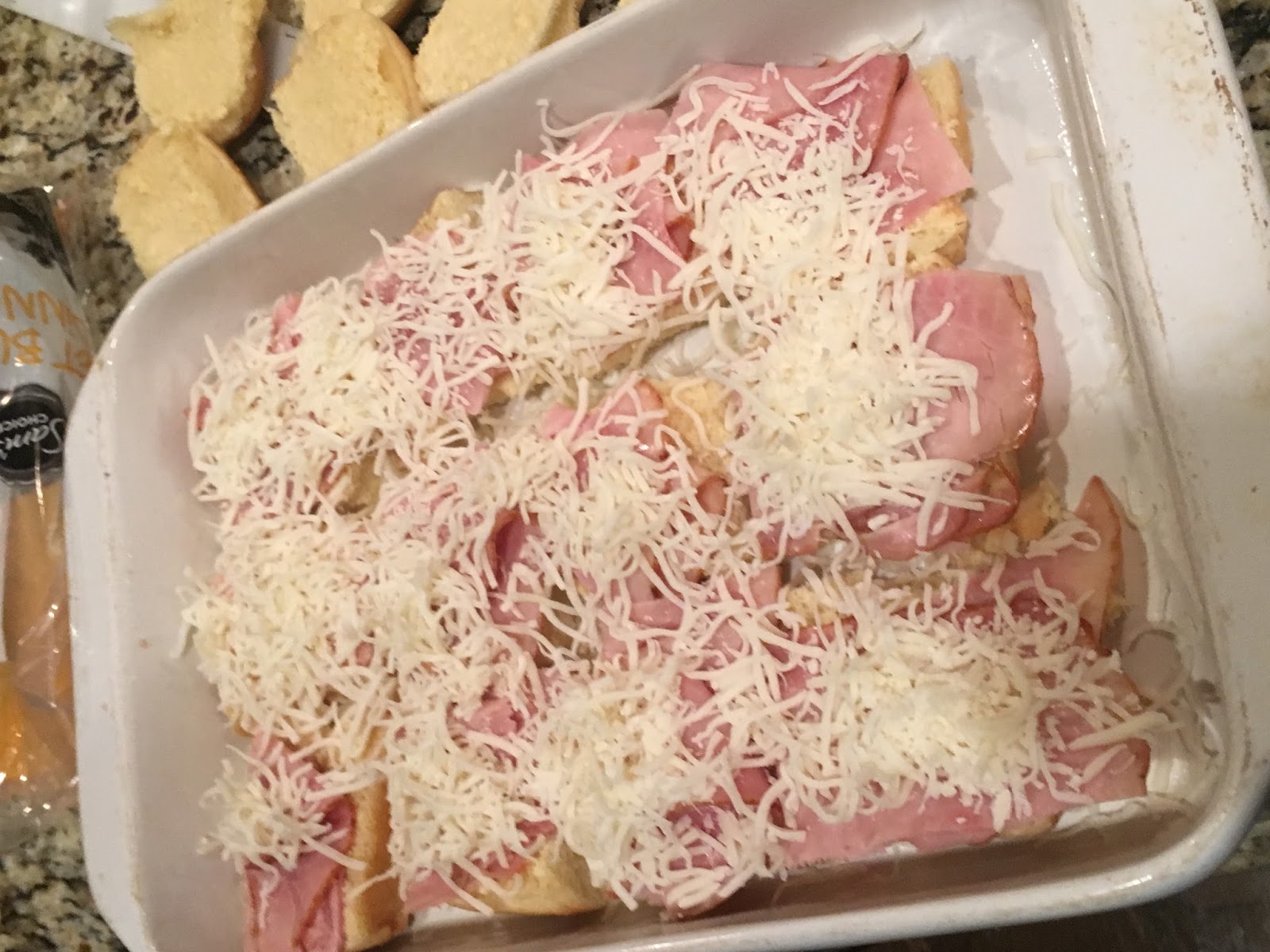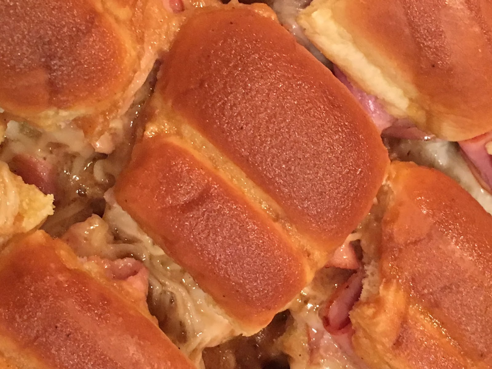 Add 2 thinly sliced pieces of honey ham to each roll bottom
