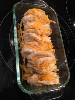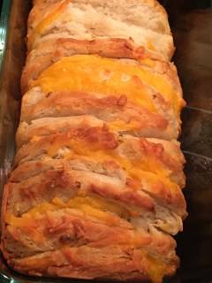 This recipe idea comes from the Cincy Shopper blog. Her recipe is called Easy Garlic and Herb Pull-Apart Loaf. My take on it below changed it to cheesy and garlicy without the extra herbs.