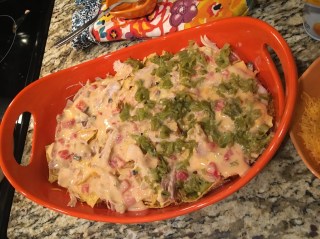 1/2 to 3/4 bag of tortilla chips (I really like LaFlavorita. A big part of that might be because a full serving is 70 calories… but I also do really like the flavor and texture of them.)