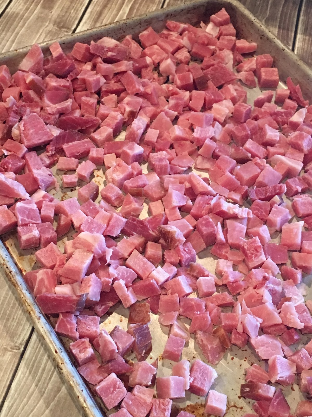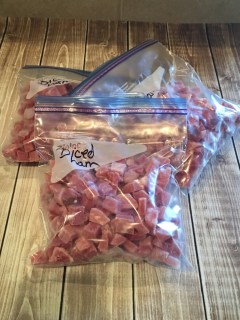 All you do is dice up the ham and spread it out on a baking sheet. Put it in the freezer for 30 minutes. This will flash freeze them in individual pieces. Then separate the diced ham into freezer bags (we used quart bags and did 2 cups each.) When you need some – you can use the whole bag or break off just what you need rather that having one clump of of diced ham that you have to use all of at once.