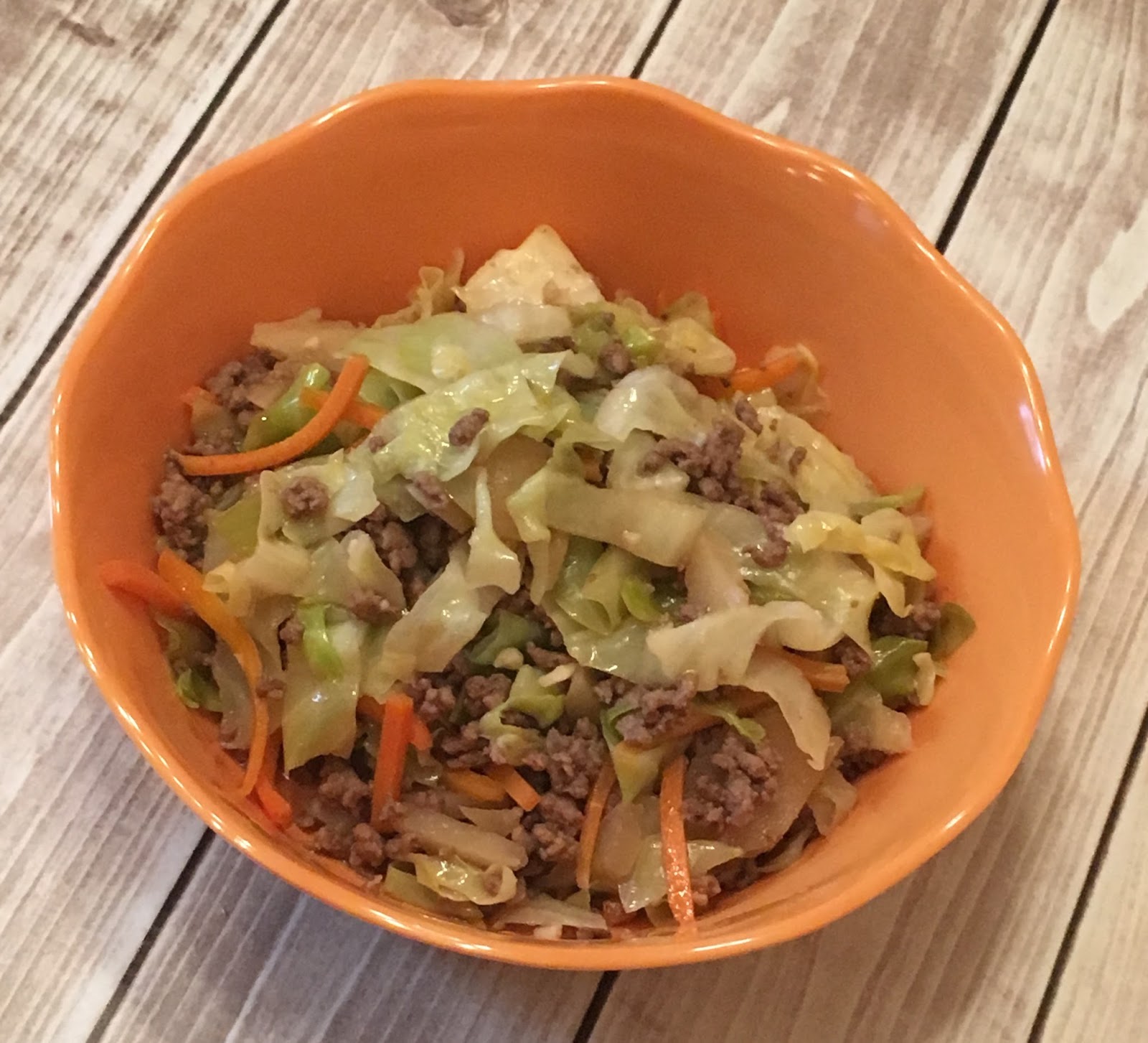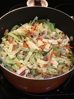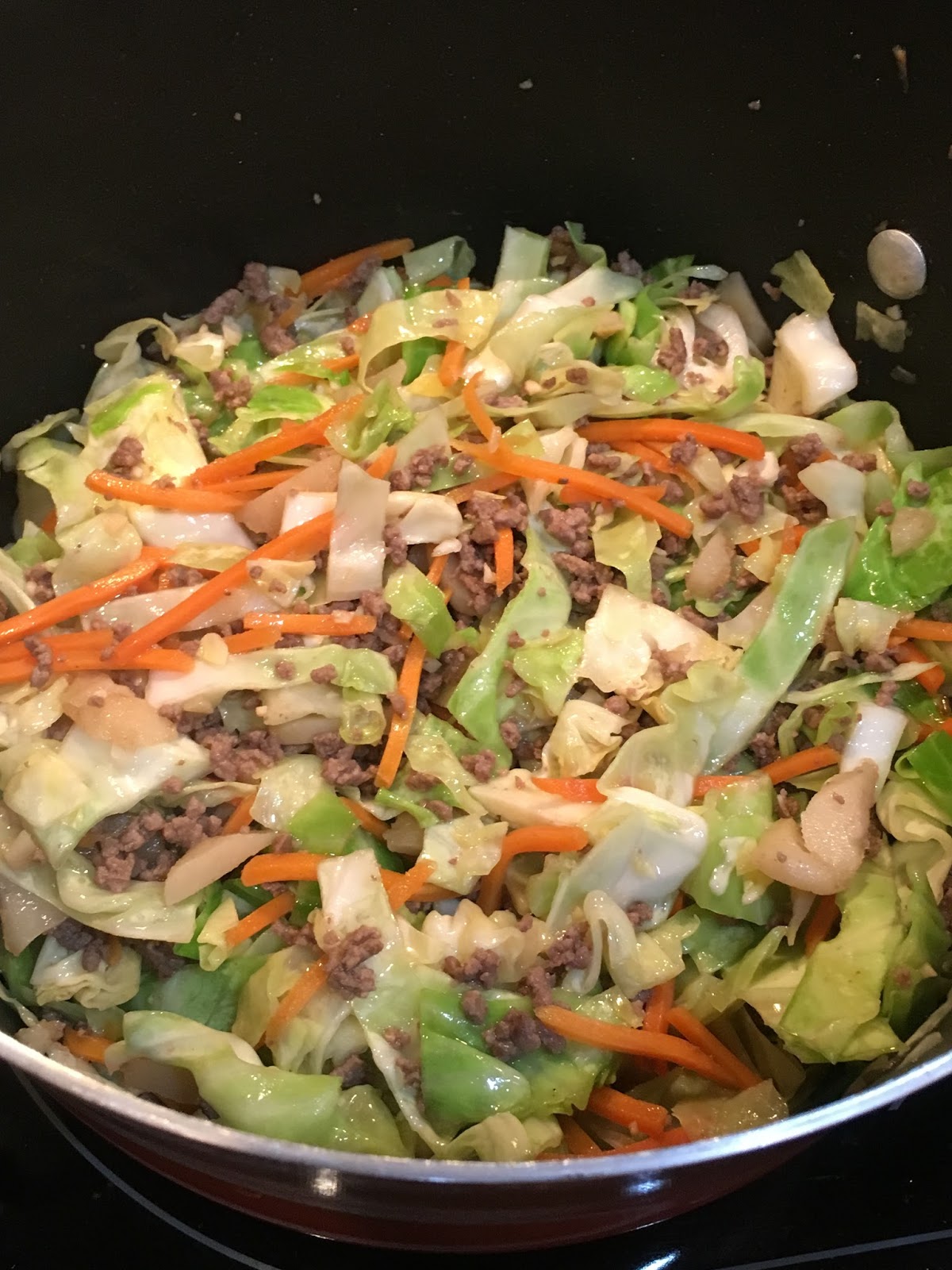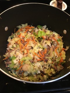 Once the meat is browned – add in the veggies and stir together for a couple minutes. Then give the sauce a good whisk and add to the meat ad veggies. Cook these together for 5 minutes or so until the cabbage has softened. If you use the bagged coleslaw from the store – you might want to reduce the cooking time some since the cabbage will be cut smaller. I added in some low sodium chicken broth (maybe 1/2 cup to give it all a little more room to groove.)