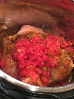 Throw it all in and stir it up. Put the lid on and set to manual for 15 minutes. (20 minutes here if you skip the next step. This time could be cut down if you wanted to cut the chicken into smaller pieces.)