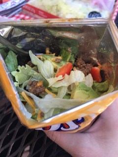 I made taco meat like normal and during that time I cut up the other ingredients. We have diced peppers, jalapenos, avocado, shredded cheese and lettuce. I made mine with fritos and it was awesome! I tasted the one with doritos and was surprised that I liked the fritos best.