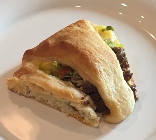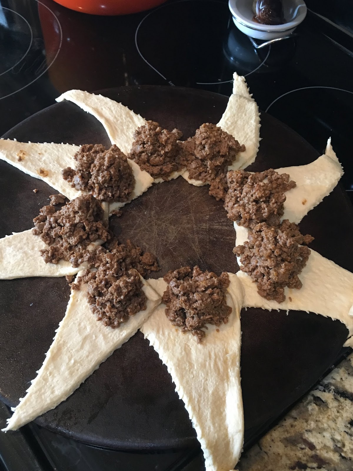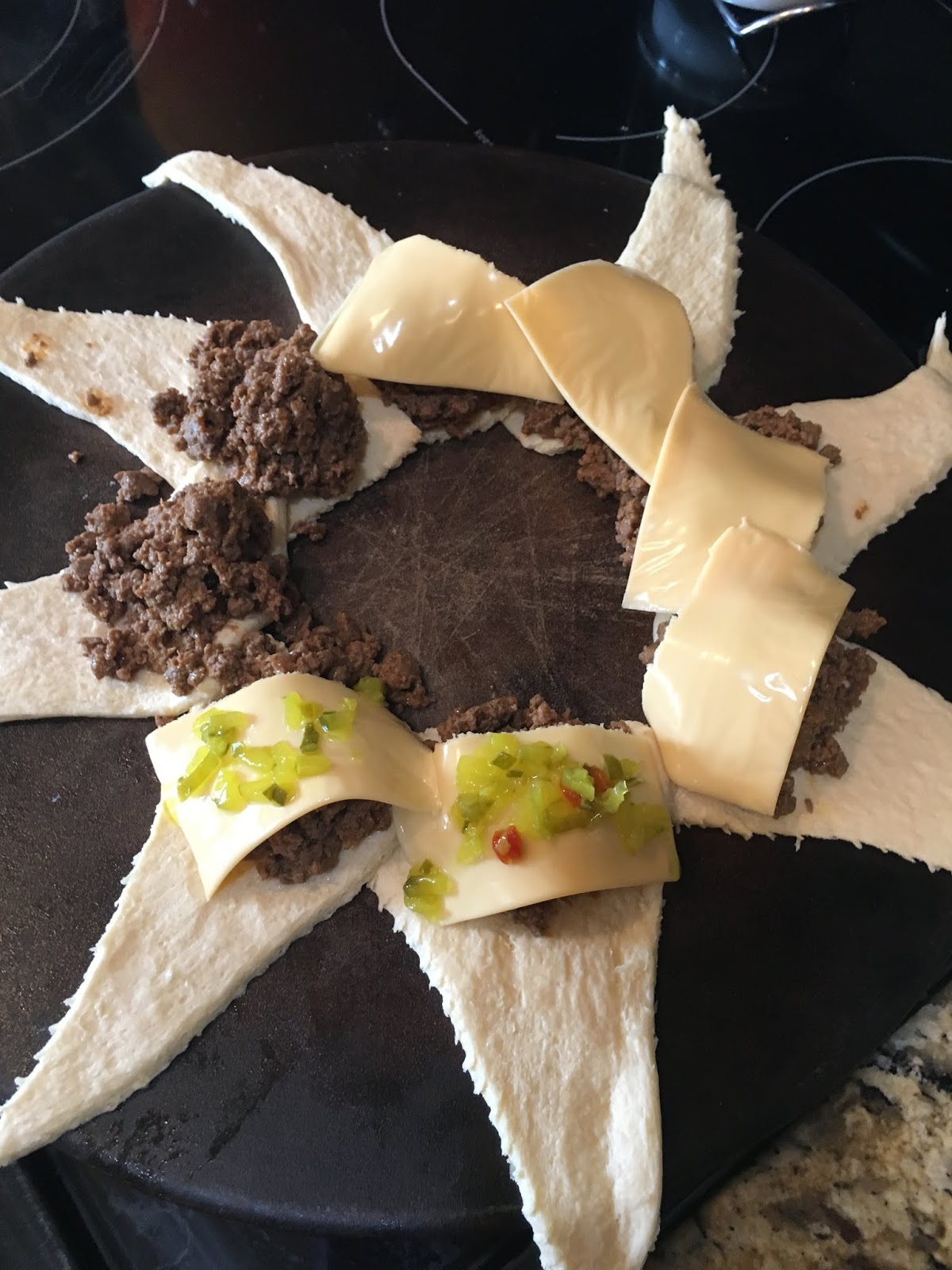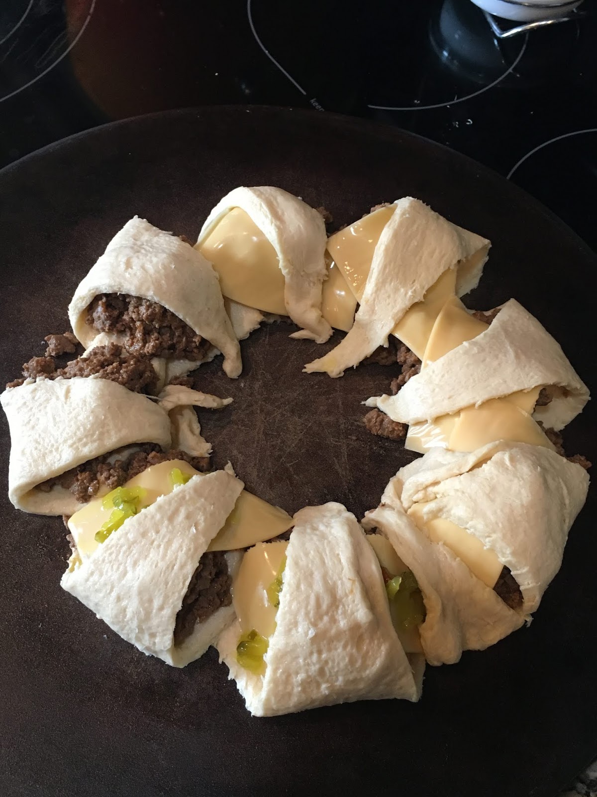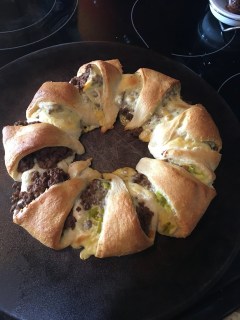 Lay out the triangles from one can of crescent rolls making a circle (the part of the triangle with the two points that are the closest being on the inside to make the circle.) Put the meat along the circle and then pull the point from each crescent roll to the middle. Add whatever toppings you would like to the “cheeseburgers”.