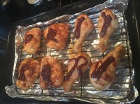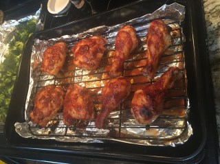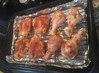 When Mark called – I pulled the chicken out of the fridge and took the skin off the thighs since we were going to be baking instead of grilling. I also took some BBQ sauce and mixed it in with the chicken to start hanging out. This had another hour or so in the fridge before I started preheating the oven.