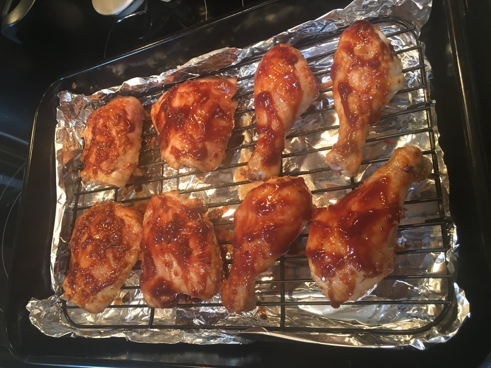 When Mark called – I pulled the chicken out of the fridge and took the skin off the thighs since we were going to be baking instead of grilling. I also took some BBQ sauce and mixed it in with the chicken to start hanging out. This had another hour or so in the fridge before I started preheating the oven.