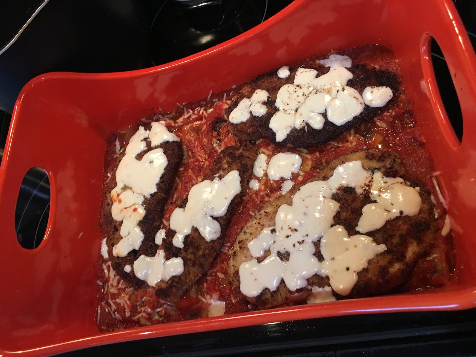 Once the chicken was cooked we put in in the oven on top of some marinara sauce with Parmesan cheese mixed in with some fresh mozzarella cheese on top for maybe 10 minutes until the cheese melted and the marinara sauce was nice and bubbly.
