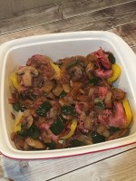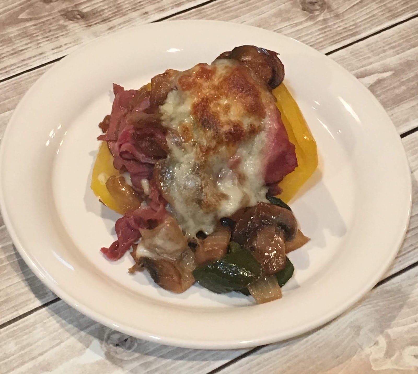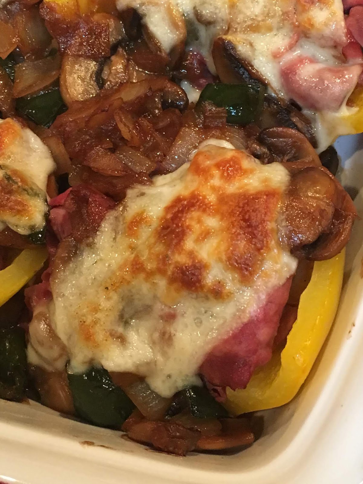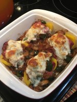 We haven’t made stuffed peppers for a while and I decided it would be a great way to use up some peppers hanging out in the fridge. This dish has the flavors of a philly cheese-steak sandwich without the extra carbs of the roll. We had most of the ingredients already on hand and just needed to get some thinly sliced roast beef. This is my favorite way to cook – look at what we already have and see what we can make.