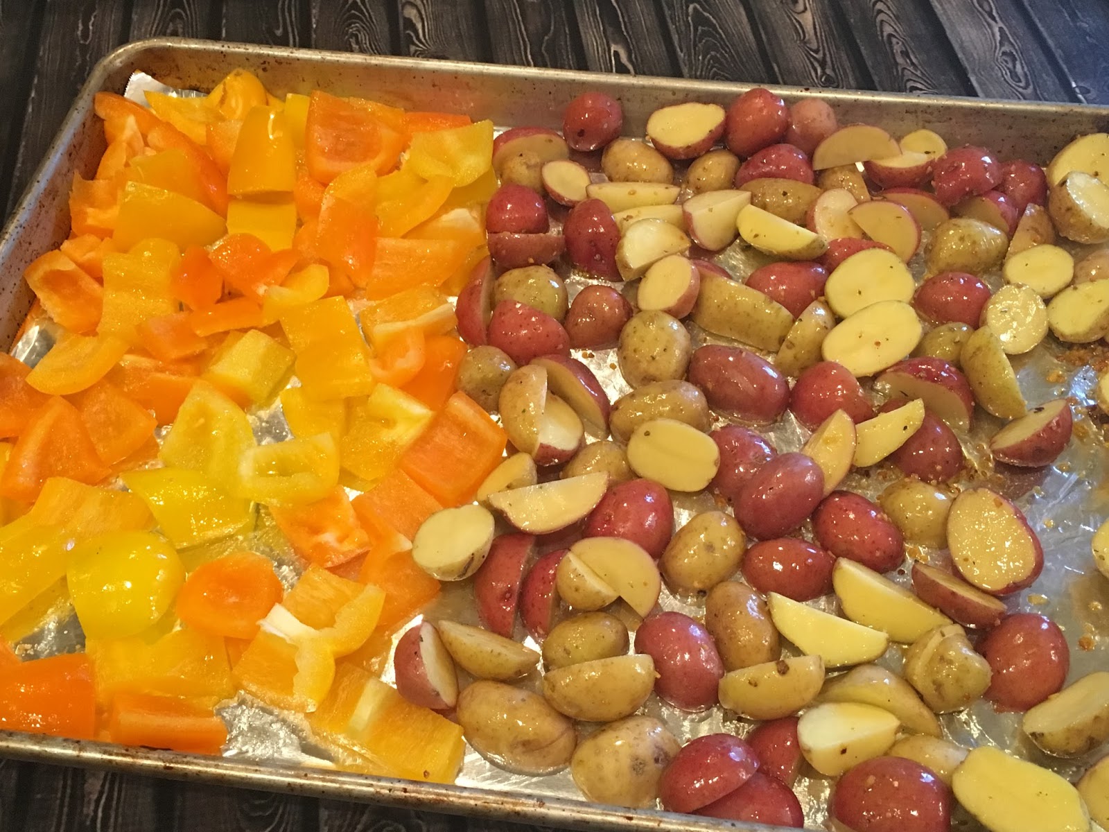 Bake the chicken tray and the peppers/potatoes for 30 mins on 400