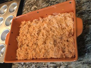 Spray a 9×13 pan with pam and then spread the chicken mixture evenly. I like to use a pan with more surface area because I like it to get all nice and bubbly from top to bottom. When I’ve used smaller baking dishes, the middle gets warm but it doesn’t feel bubbly hot.