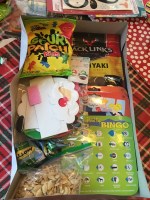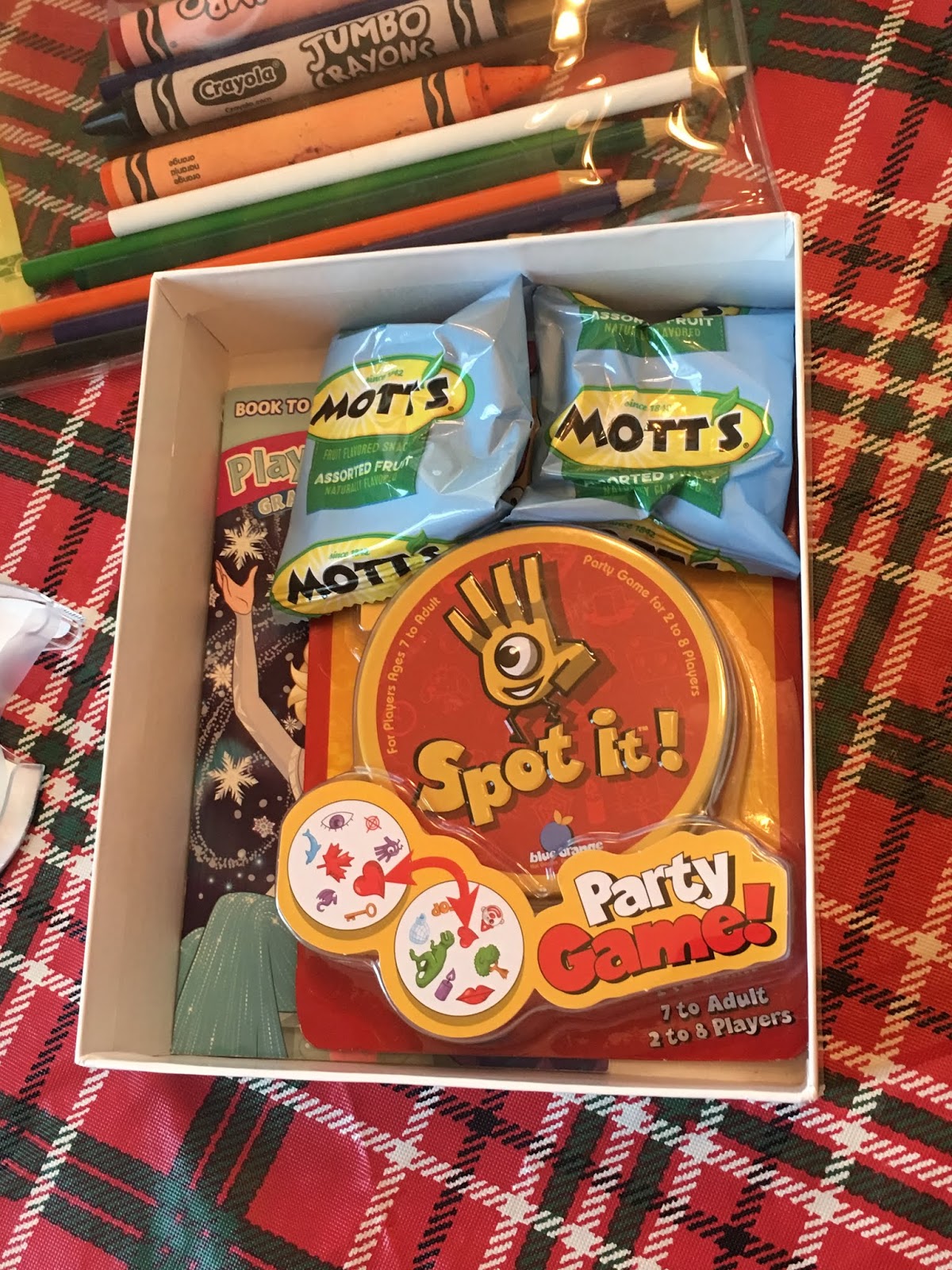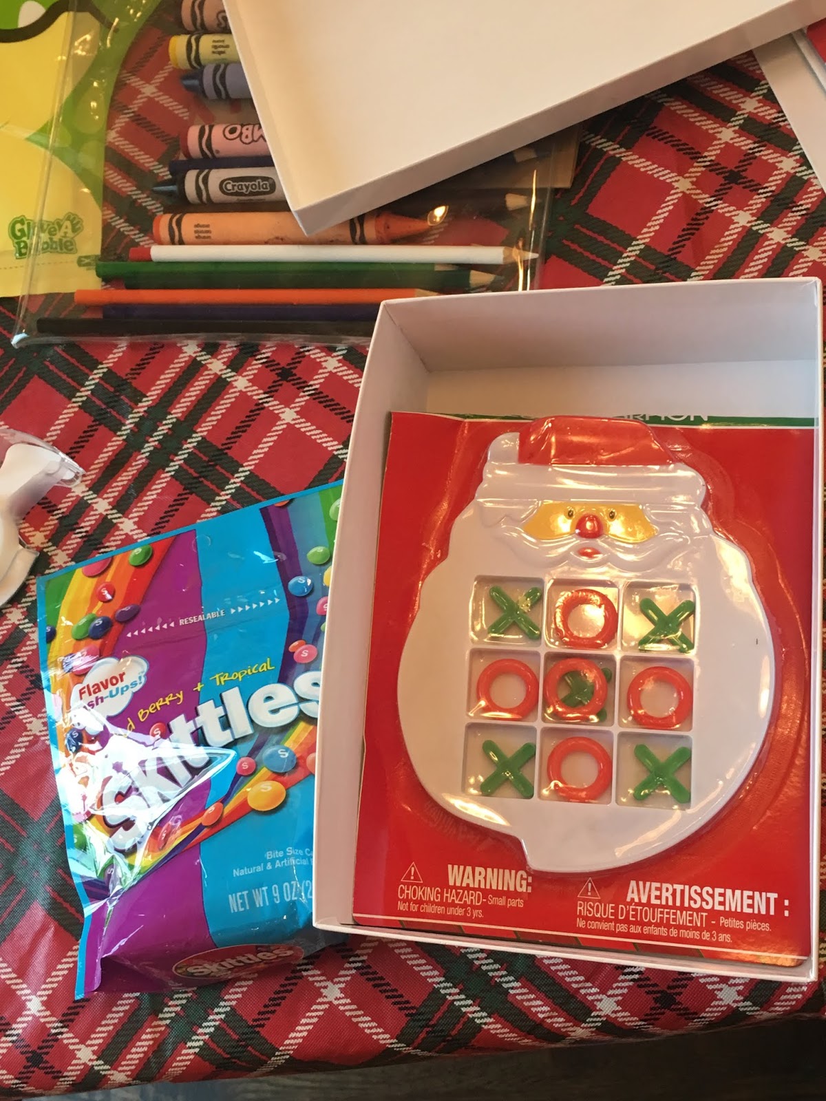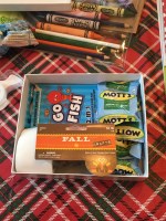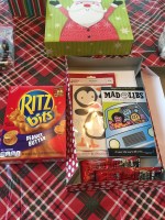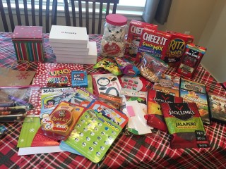 The gist of the idea is – putting together boxes of goodies made up of snacks and activities to do along the way. Here’s a picture of what went into the boxes. Turns out my eyes were bigger than our amount of boxes and there’s way more here than what was actually put in the boxes, but this was my starting point. I bought the snacks and treats but most of the games and activities were things we already had (card games, coloring books and mad libs), were lent to us (car bingo) or were bought at some point for a rainy day because I got them on sale.