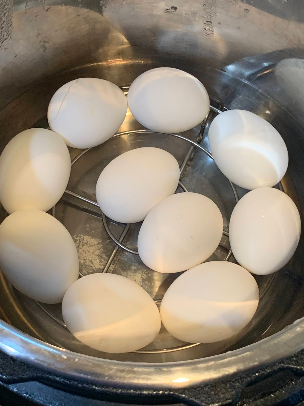 Put about a cup of water at the bottom of the IP and put your steaming rack in. (Our little metal steaming rack came with the instant pot.) Then arrange your eggs. We have the 6 quart IP and 10 eggs fit perfectly.