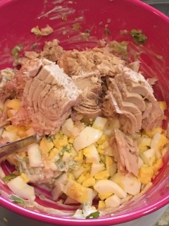 Add in the tuna and eggs: I like to add these at the end to help them hold their texture.