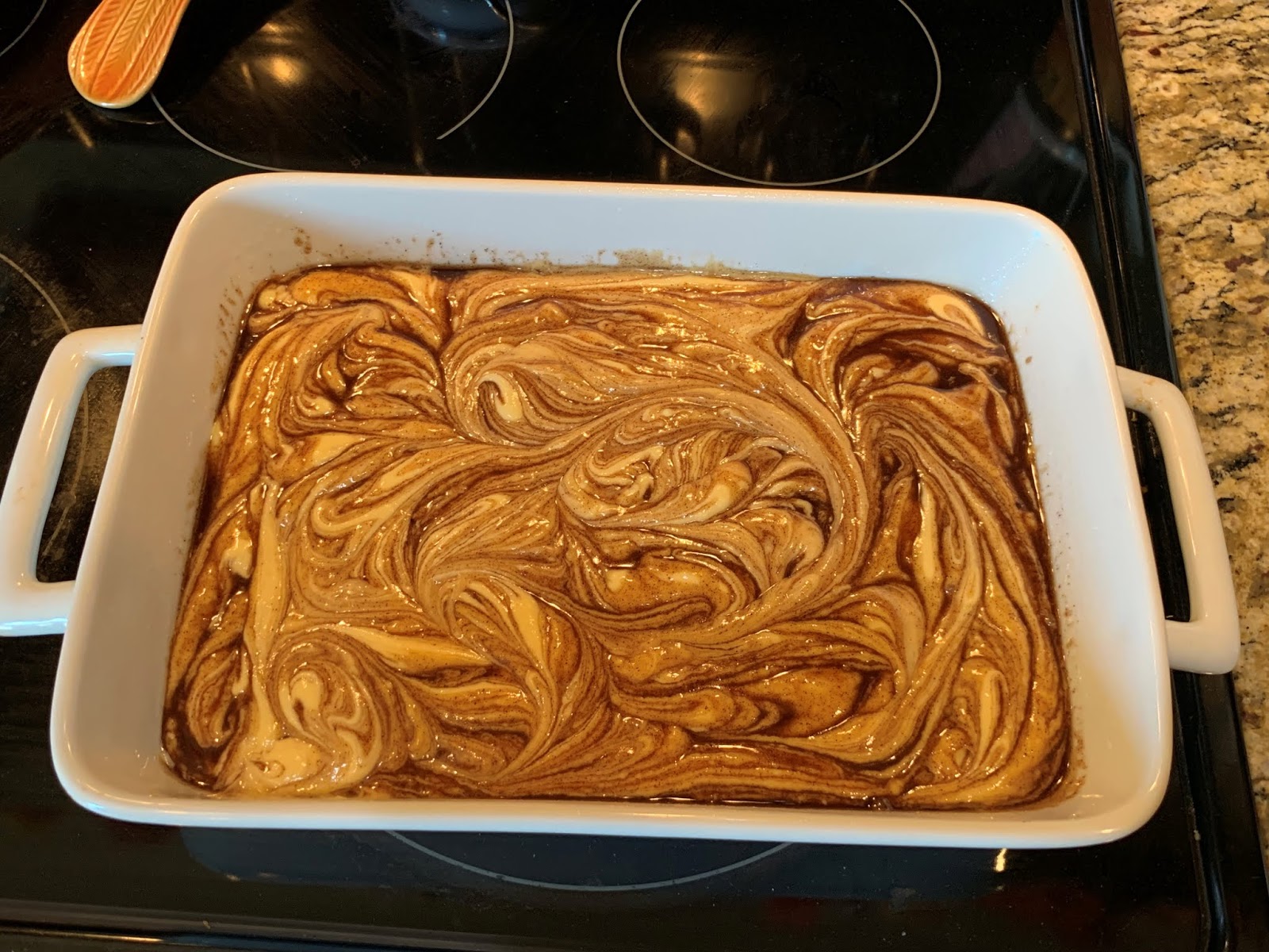 Use a knife to swirl it around into the cake batter without completely mixing it together.