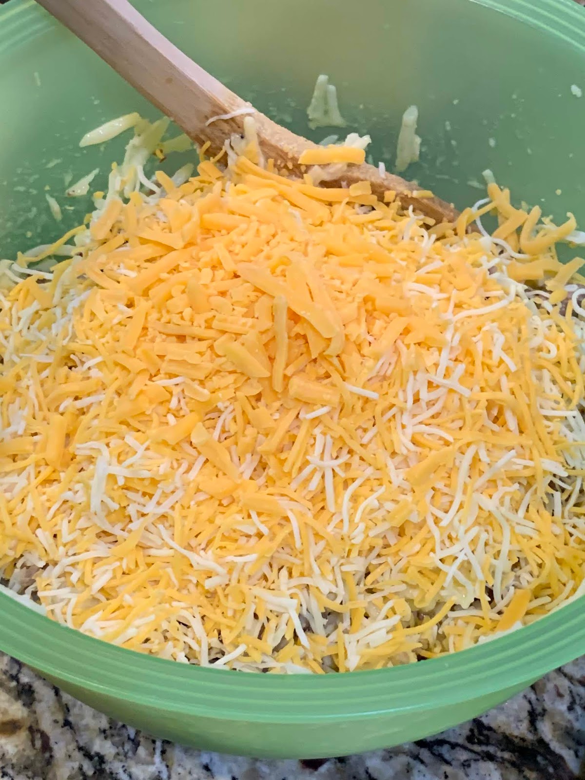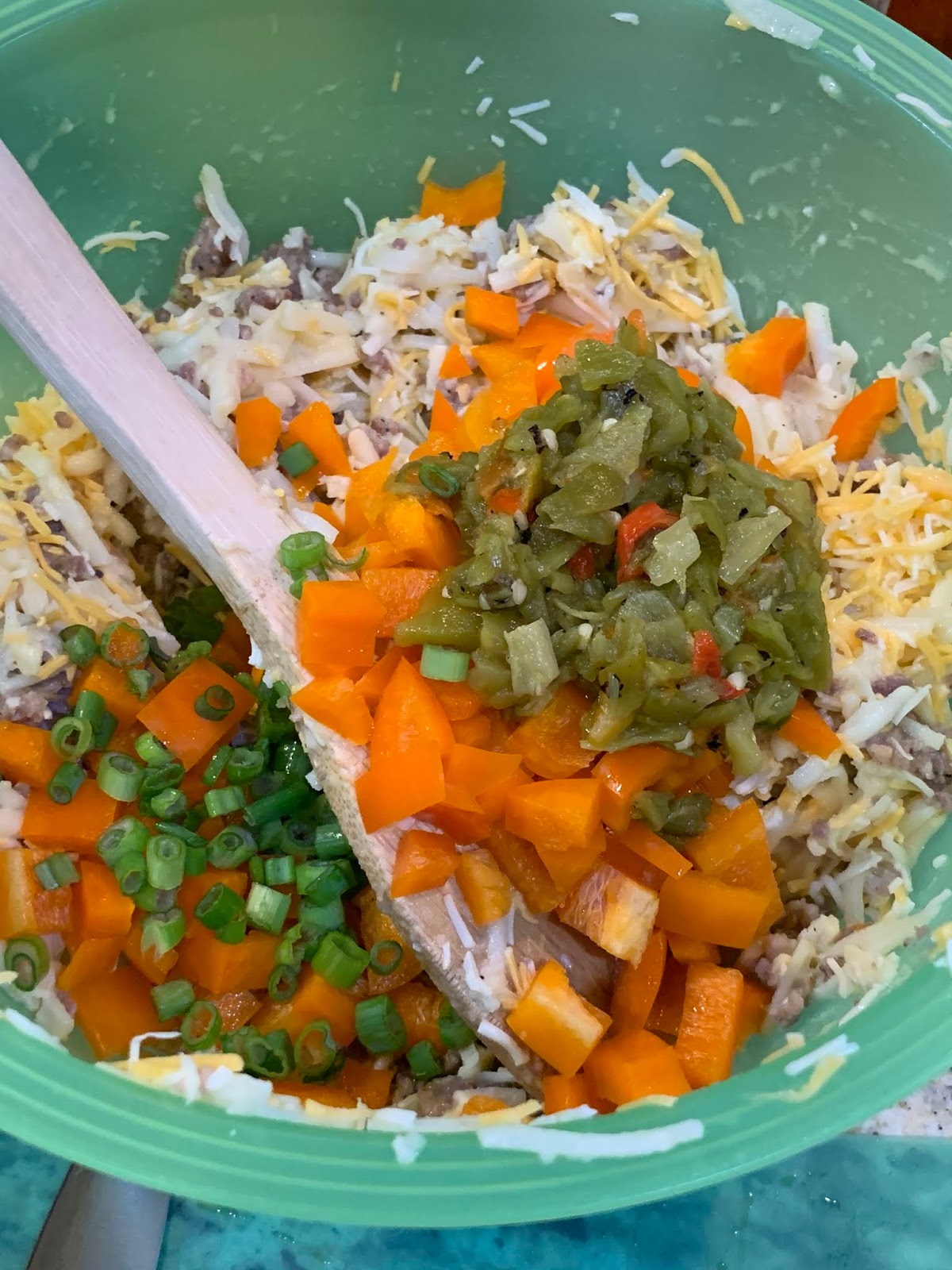 I put 1/3 of this mixture on one side of a 8 x 12 baking dish and then with the other 2/3 in the mixing bowl I added green chiles, green onions and diced orange pepper.