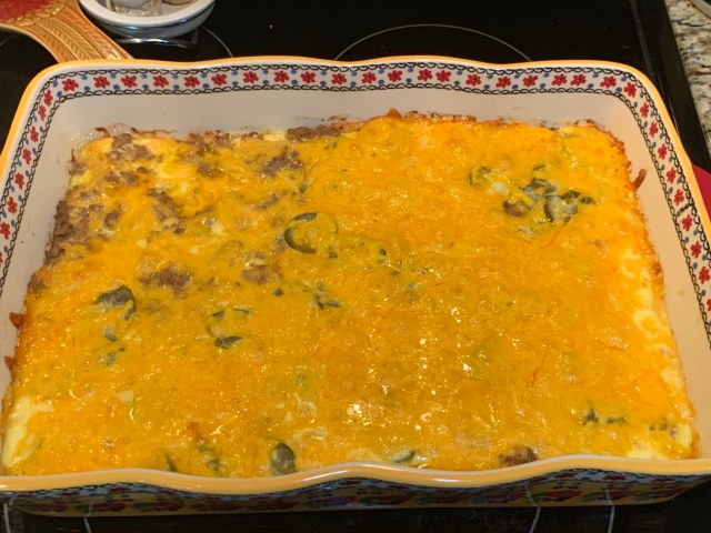 Whisk together eggs and 1/2 and 1/2 – then stir in cheddar cheese