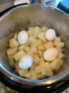 Oh my goodness! This is a game changer in the potato salad world. If you’re planning on making some potato salad over this holiday weekend – I highly recommend using your Instant Pot to cook your potatoes and your eggs at the same time.