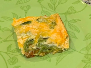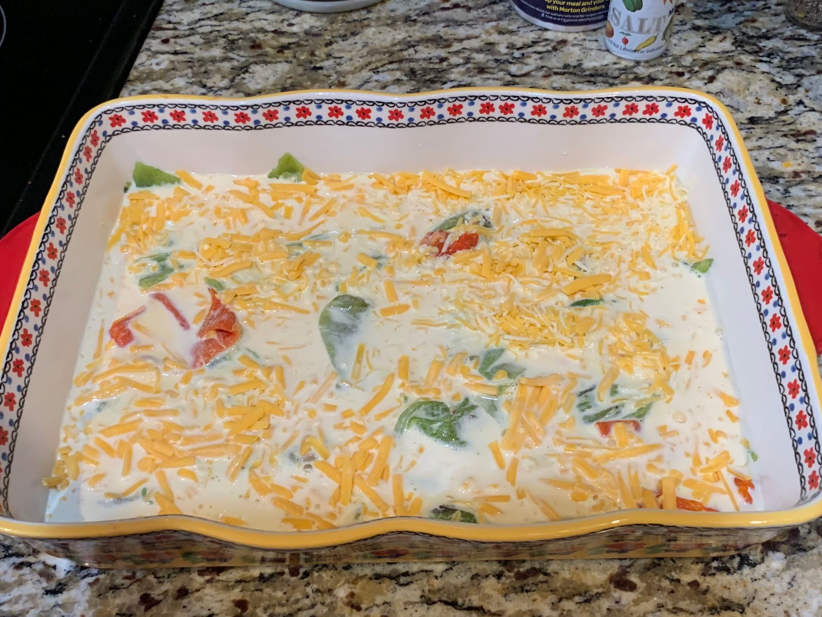 Layer 1/2 the green chiles in a 9×13 pan then 1/2 the cheddar cheese and repeat each layer one time