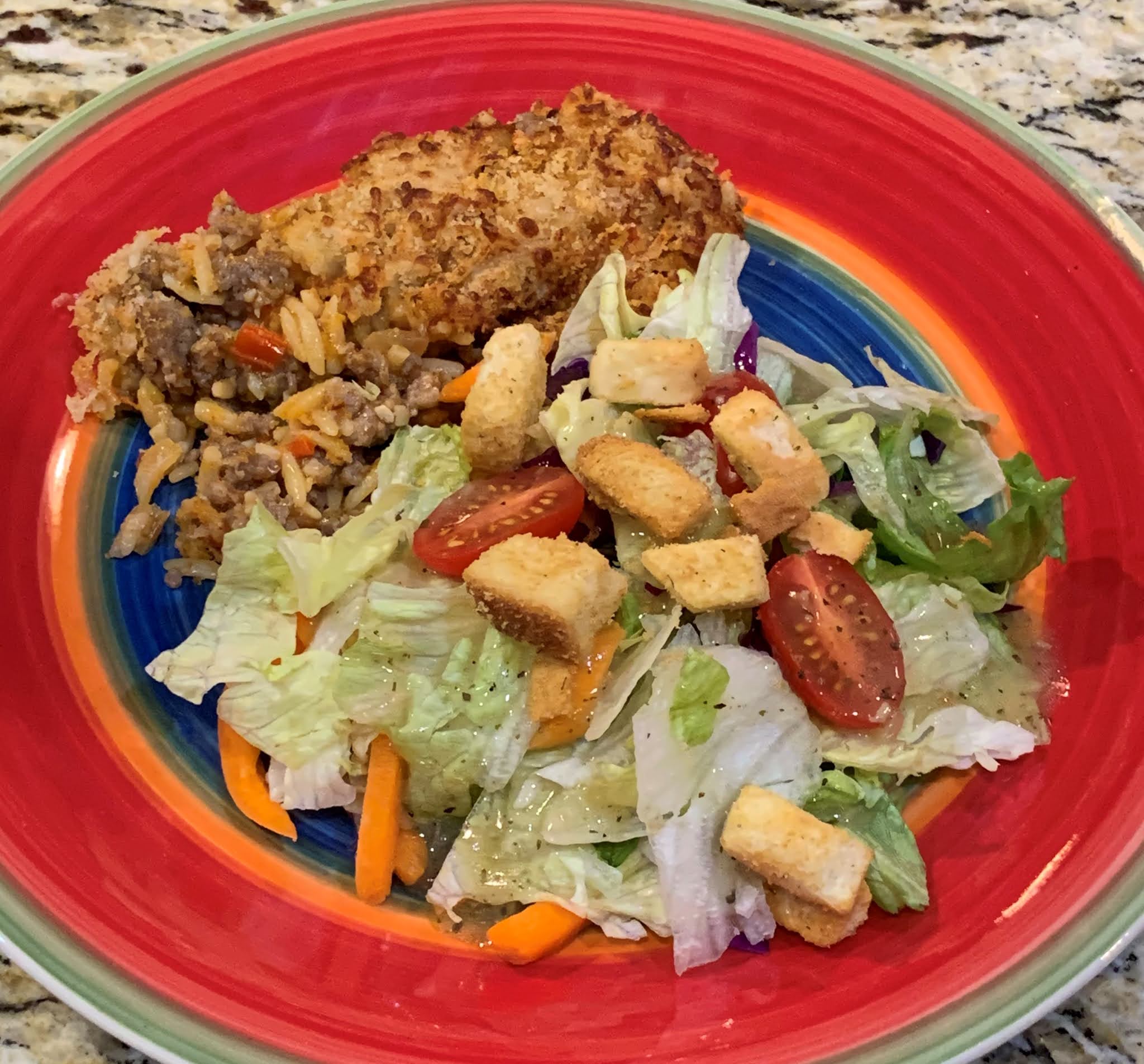 I haven’t cooked a lot with orzo and this recipe makes me want to use it more in our kitchen. This dish brings out a creaminess that I didn’t expect. Don’t be alarmed by how big the salad looks next to the main dish. I totally had to go back for seconds on this one.