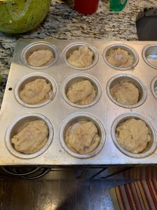 This made 9 muffins for us. Spray your tin with non-stick spray and layer in 1/2 banana muffin batter then sprinkle with sugar/cinnamon swirl then the other half of the batter topping it off with a little more sugar/cinnamon swirl.