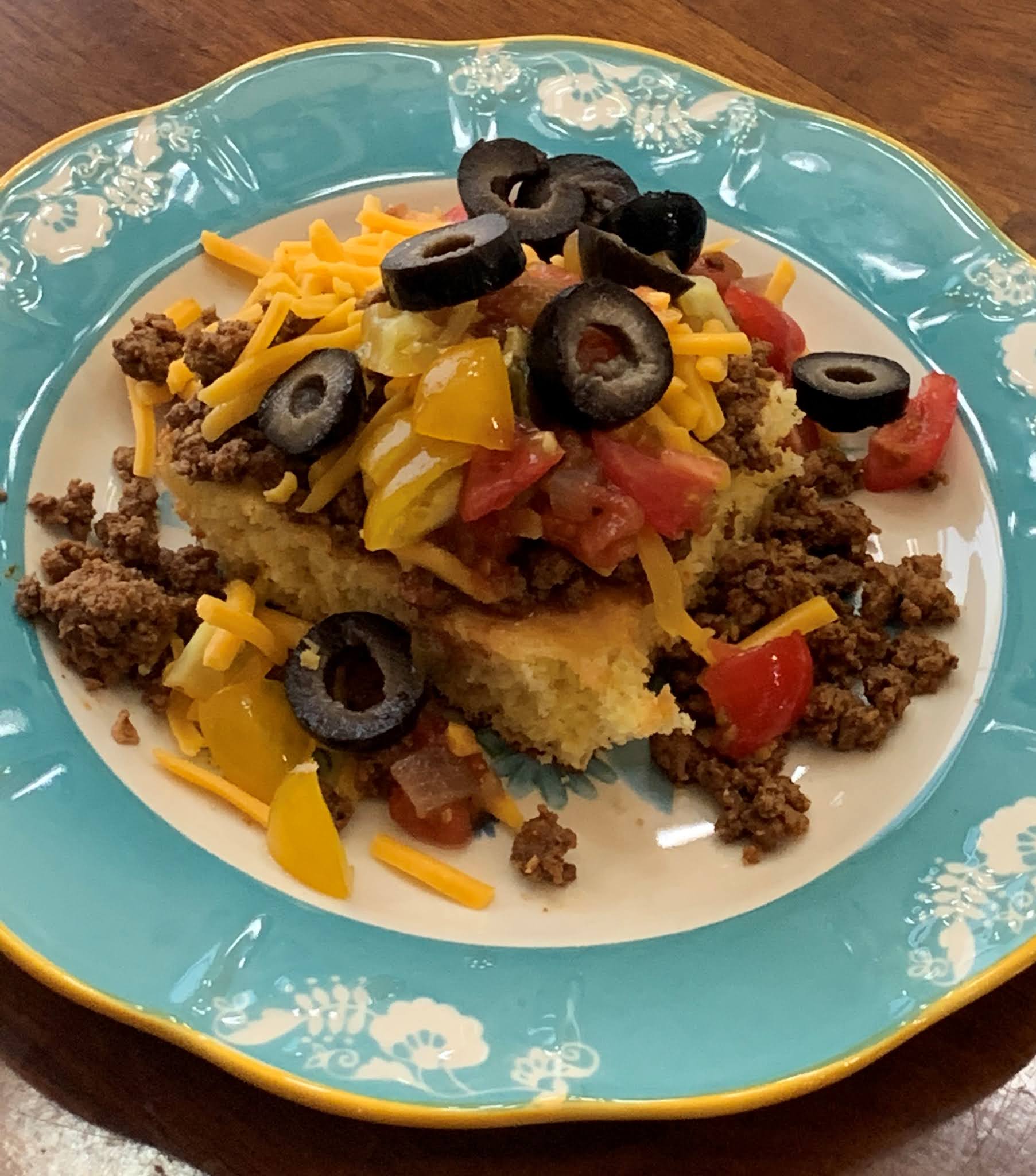 Cook up your taco meat like you normally do for tacos and then each person can layer up their “tamale pie”. What I did is pictured above. Connor did extra cheese with no olives or tomatoes. Emily did no cheese and no olives with extra tomatoes. Haley did… All. The. Things. along with extra sliced olives in the end.