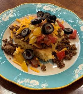 On this day – I made some boxed cornbread and we topped it with the things that would generally go along with a tamale pie and it was great. Everyone loved it and requested that it be put in their cookbooks! That is a win in my book!