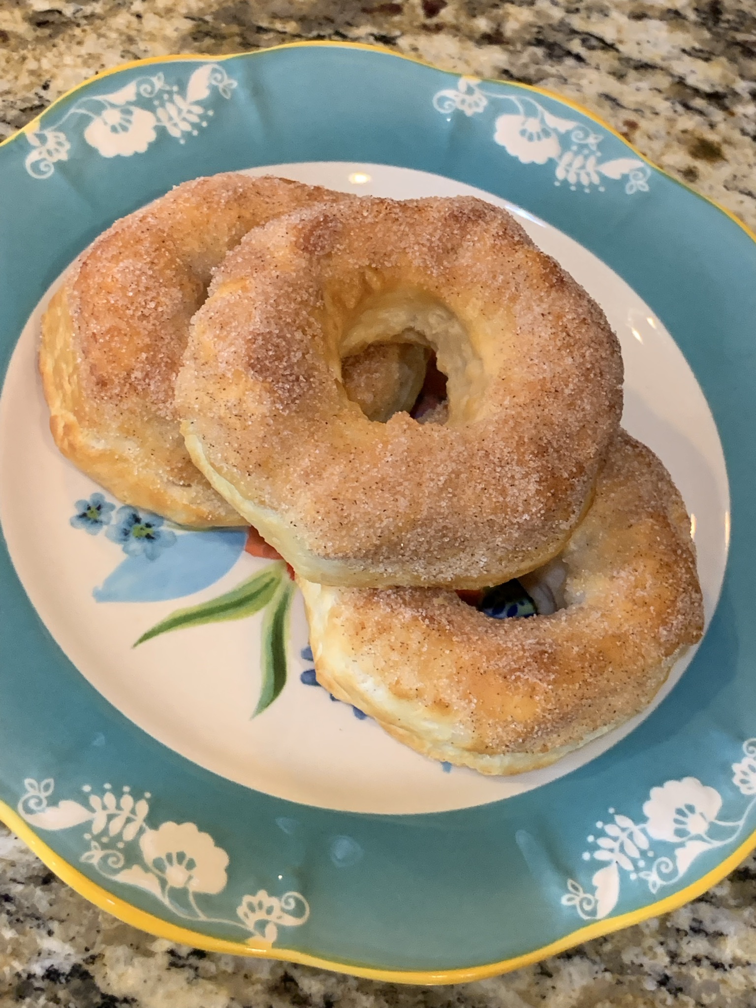 The kids were super excited when I said we would be having donuts for breakfast and then confused when I said we weren’t going to the store to pick them up. These are ridiculously easy and so tasty! I’m sure the tastiness factor increases with the level of butter used to help the cinnamon sugar stick – we tried to go a little on the lighter side.